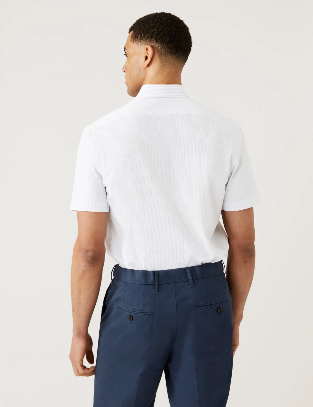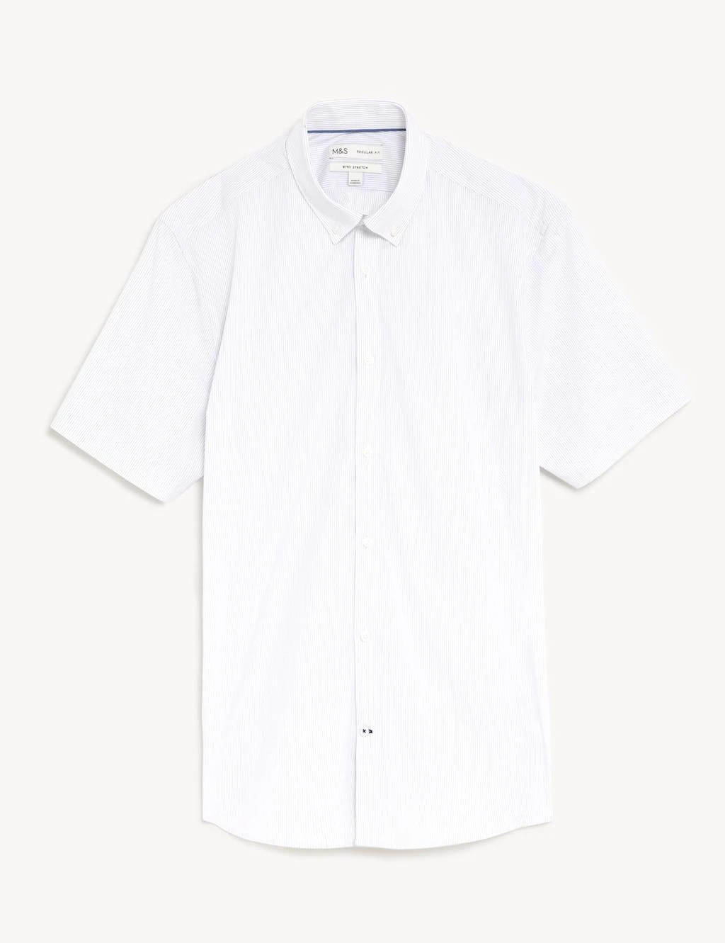 With its subtle stripes and crisp cotton-rich fabric, this shirt is equally at home on smart and casual occasions. Regular fit, with easy short sleeves and a neat button-down collar. A touch of stretch in the material ensures comfort and our easy-to-iron finish makes light work of the laundry.
