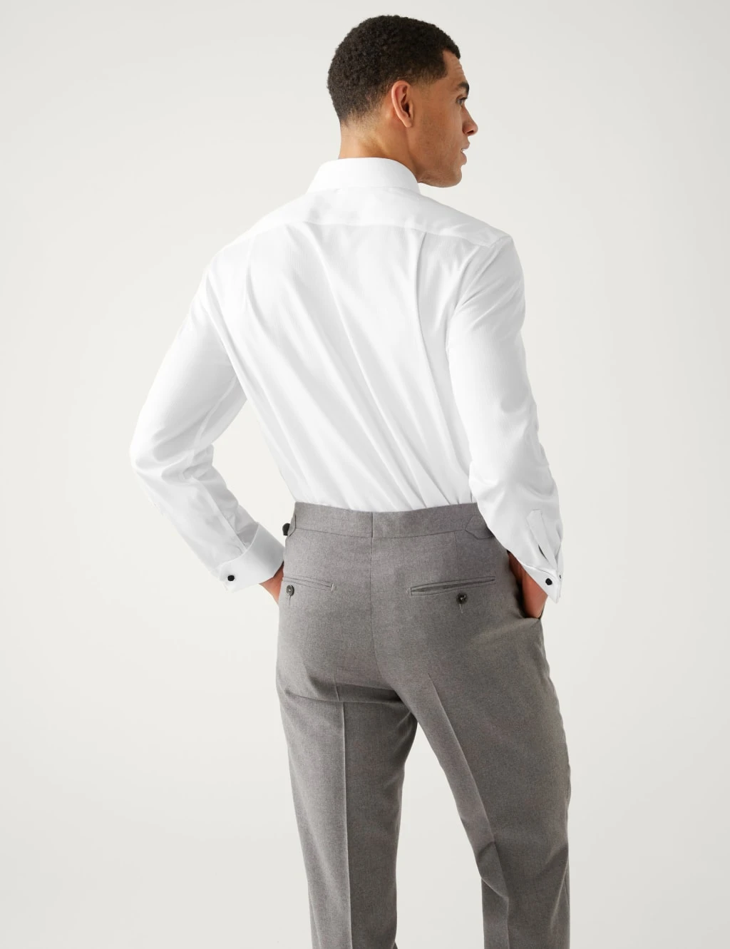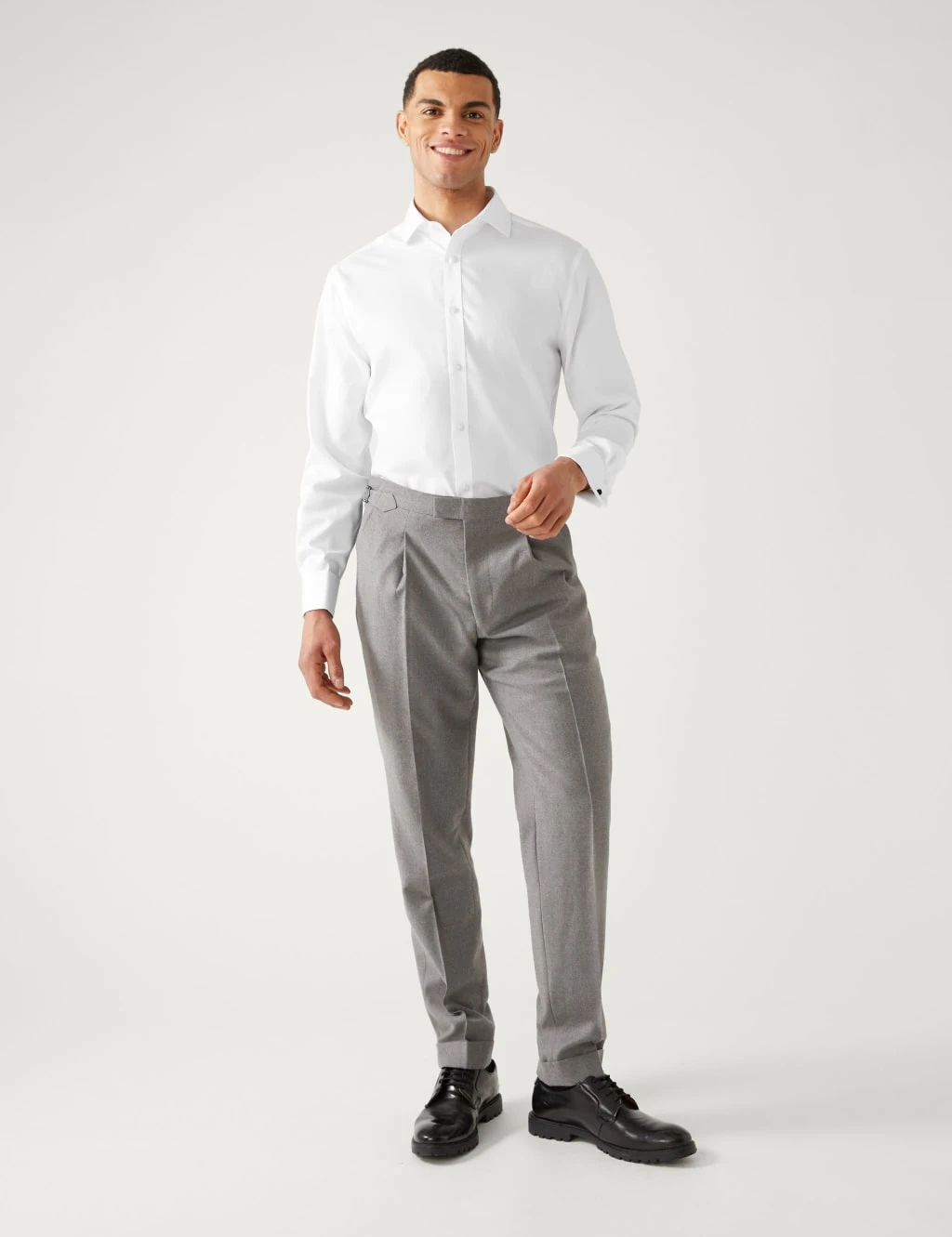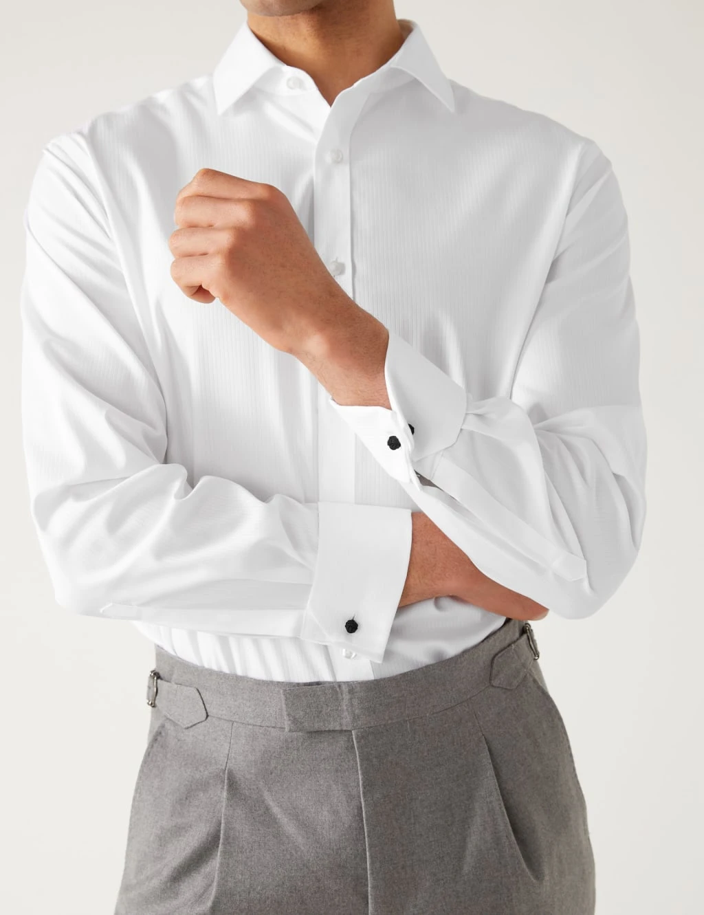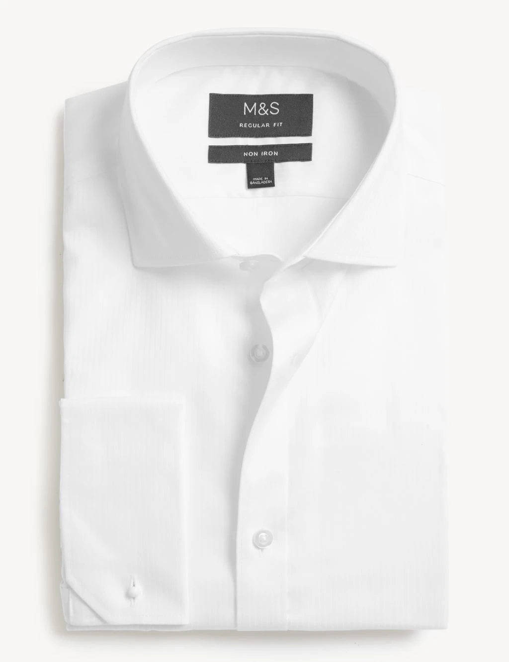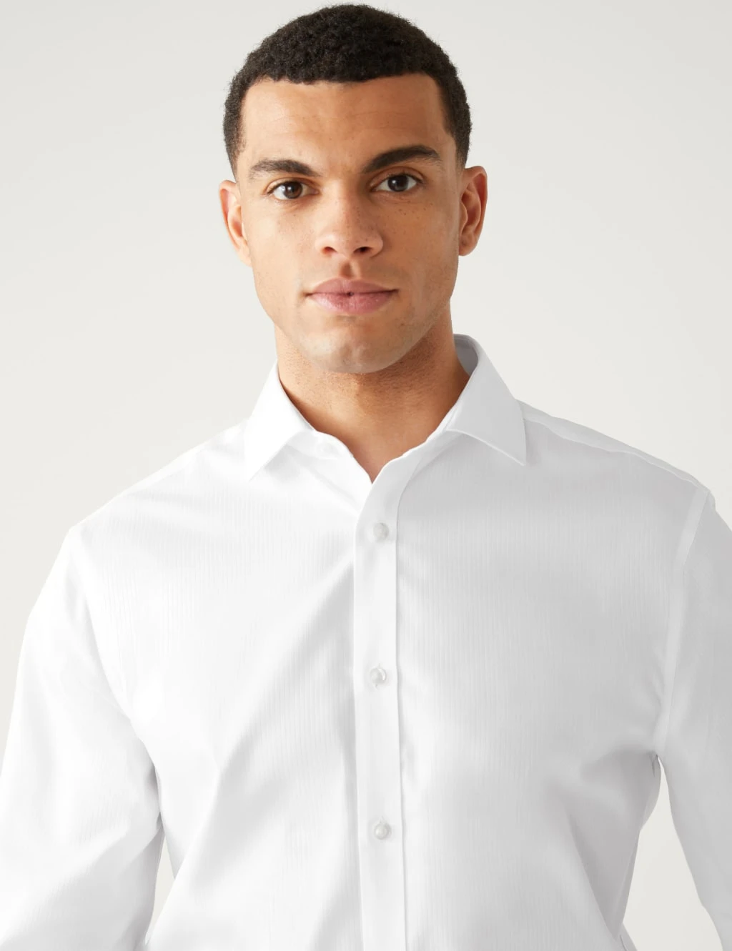 This stylish pure cotton shirt features a subtle sateen stripe for a timelessly elegant look. The button-down design is cut in an easy regular fit with a traditional cut-away collar and double cuffs. A clever non-iron finish makes laundering easy.