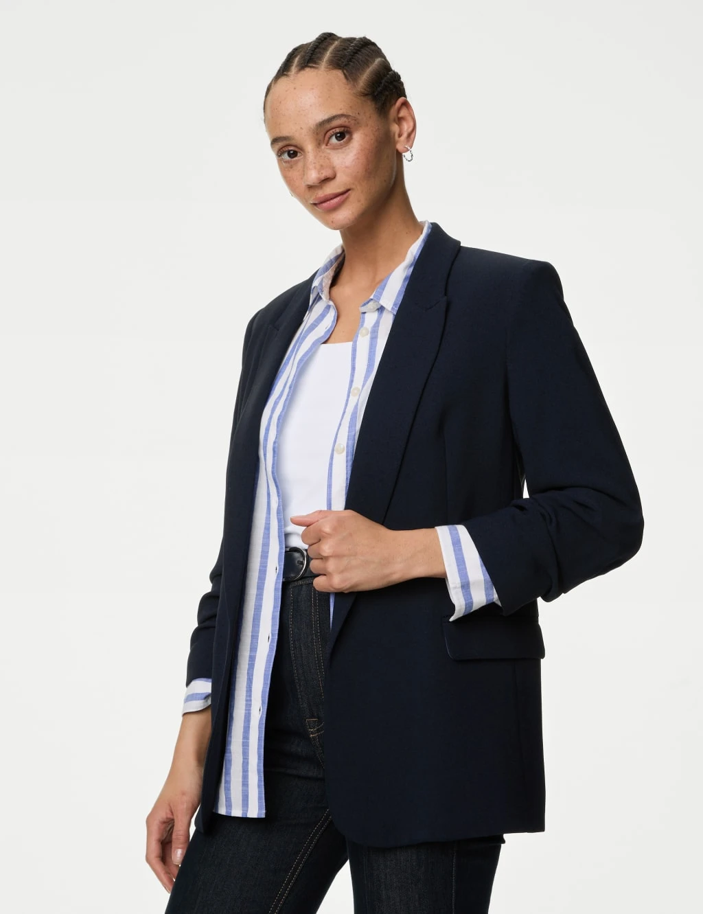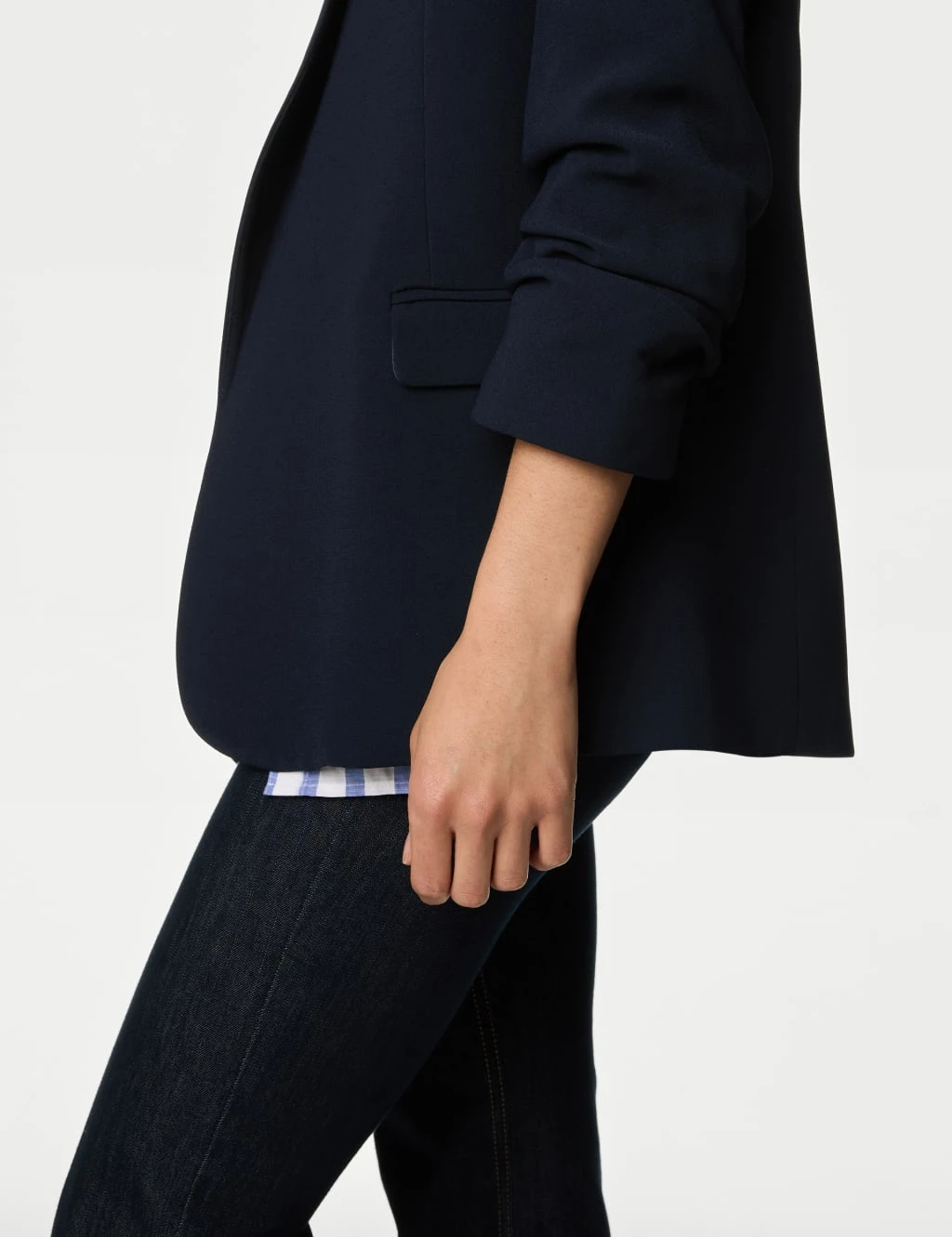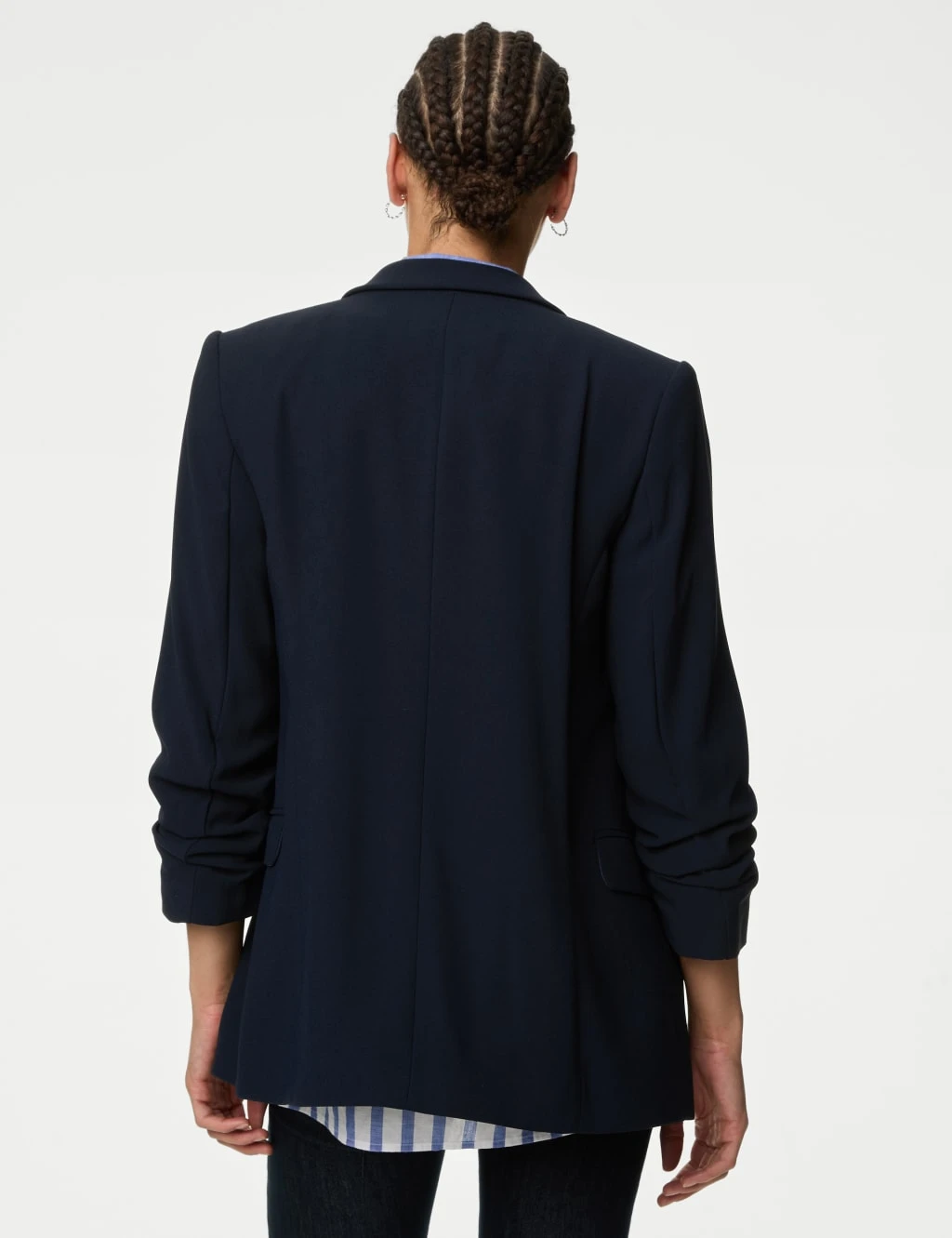 Slip into this ruched sleeve blazer to bring a smart touch to any ensemble. It has a relaxed fit for a laid-back look and faux pockets to add a dash of suave detail. A lining gives a smooth feel.