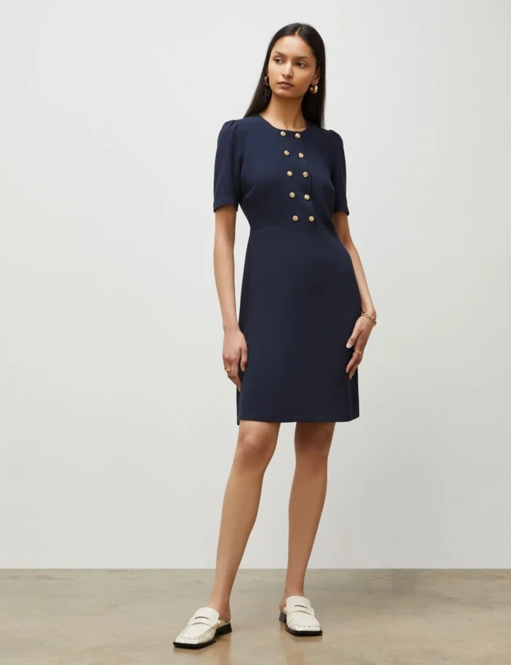 Add a touch of sophistication to your wardrobe with this shift dress from Finery London. It’s cut to a regular fit, with neat short sleeves and a round neck. Two columns of eye-catching golden buttons bring luxe detail to the bodice, while the skirt falls to a mini length for a modern, playful look.