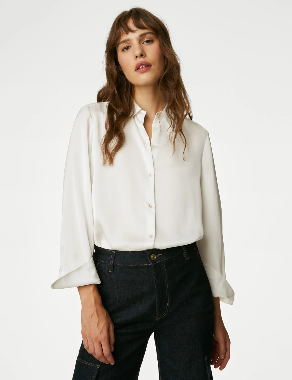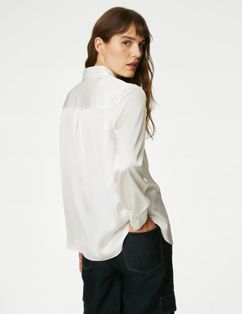 This elegant shirt is crafted from satin for an irresistibly smooth feel. Regular fit, with a button fastening running down from the collared neck for a smart look. Long sleeves with neat cuffs accentuate the tailored style. Made with recycled polyester.
