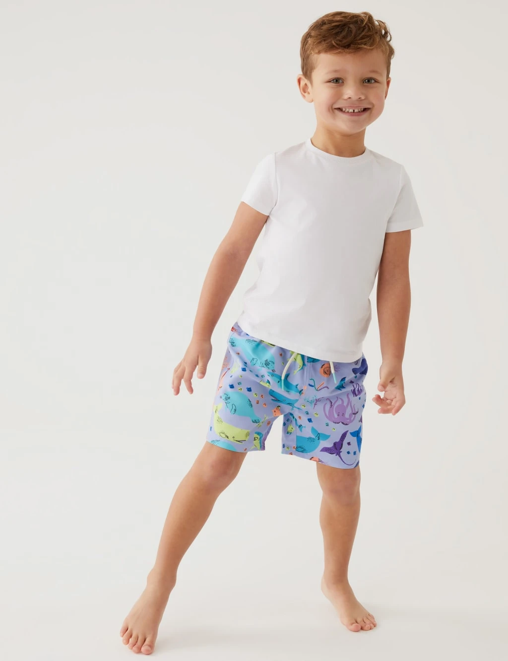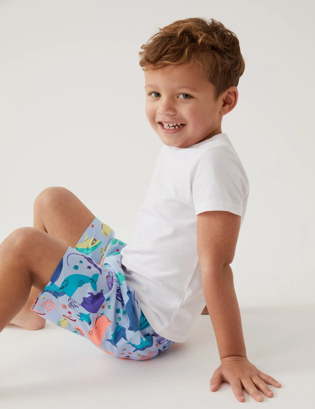 Decorated with a bright sea creature print, these swim shorts are perfect for their watery adventures. Regular fit, with an elasticated drawstring waist for comfort and flexibility. Dress them with confidence, knowing that the Sun Smart UPF50+ fabric is endorsed by the British Skin Foundation for helping to protect against harmful UV rays.