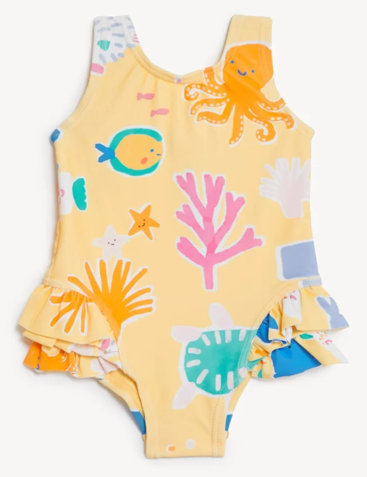 With its bold sea life print, this sweet swimsuit is perfect for playing at the pool. Made from chlorine-resistant fabric with flexible added stretch. Featuring pretty frills at the legs. Sun Smart fabric is endorsed by the British Skin Foundation and helps provide protection against harmful UV rays.