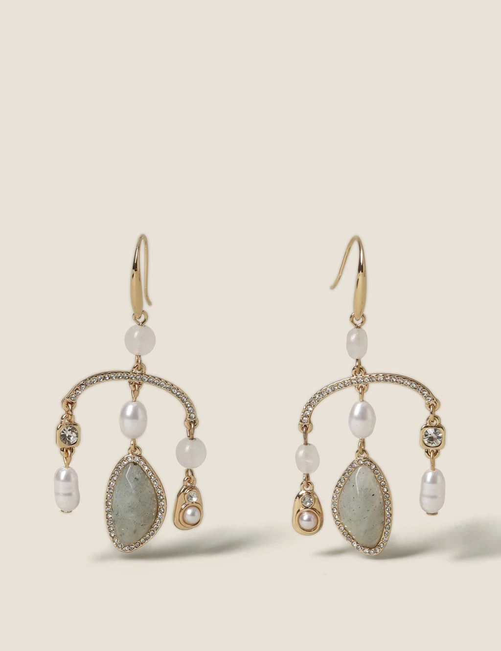 These gold tone Earrings sit in a Mobile style Frame with 3 motifs. The Centre stone is a semi precious stone, that sits in between a single faux pearl and a single white stone