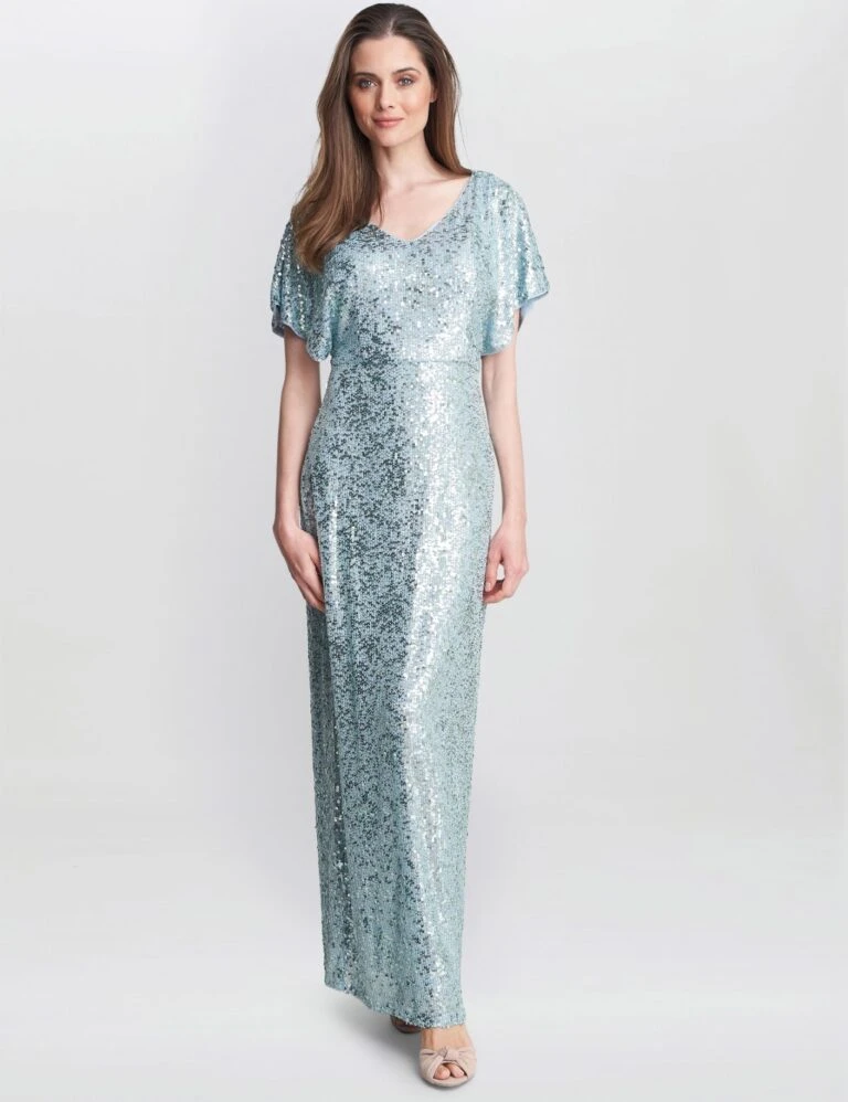 This shimmering floor-length dress by Gina Bacconi will see you through party season in style. Cut to a regular fit, it has an elegant v-neck and drapey short sleeves. Embellished with sequins all over, this timeless column dress is slightly fitted through the waist and hips, before flowing into a straight skirt that has a back split for easy movement.