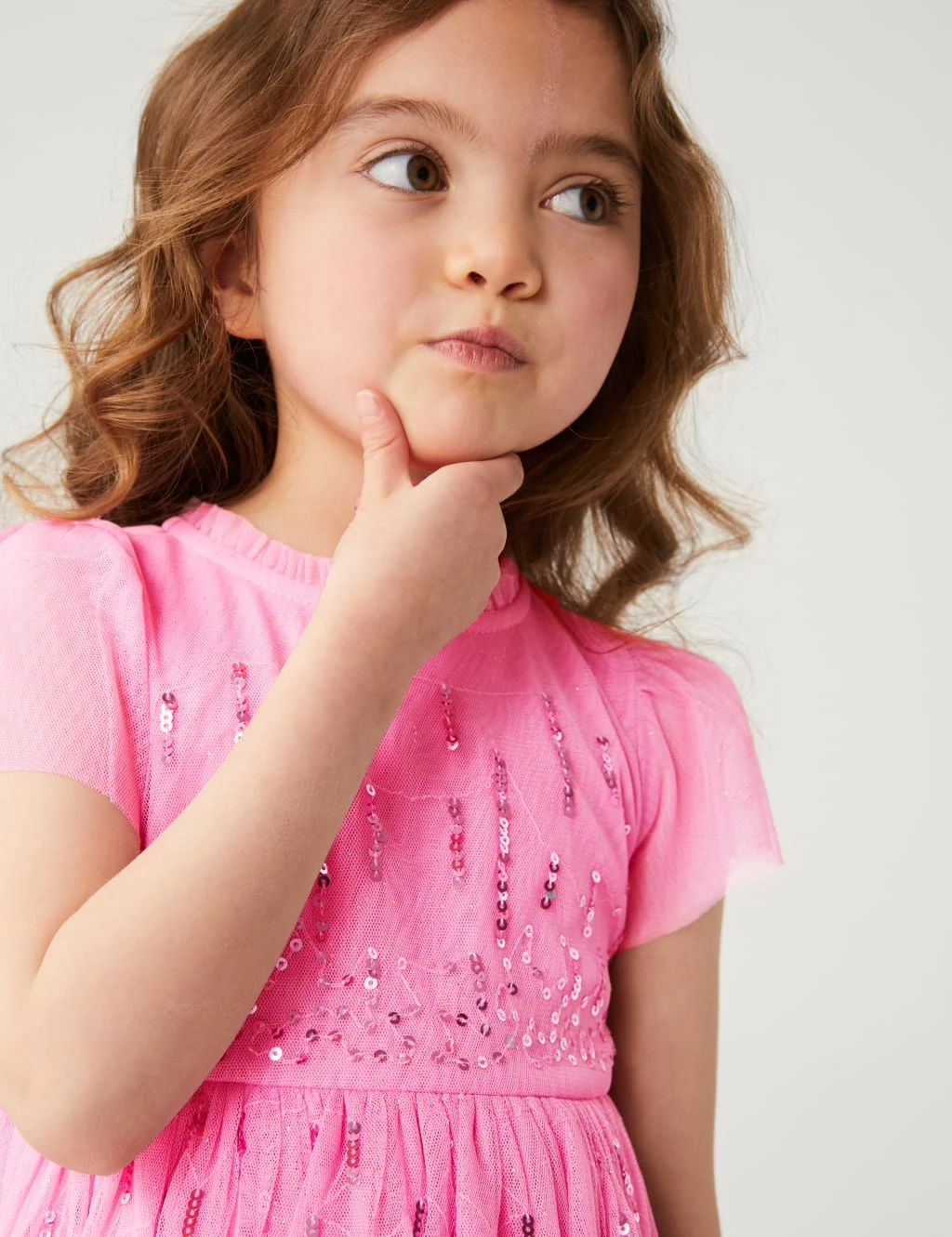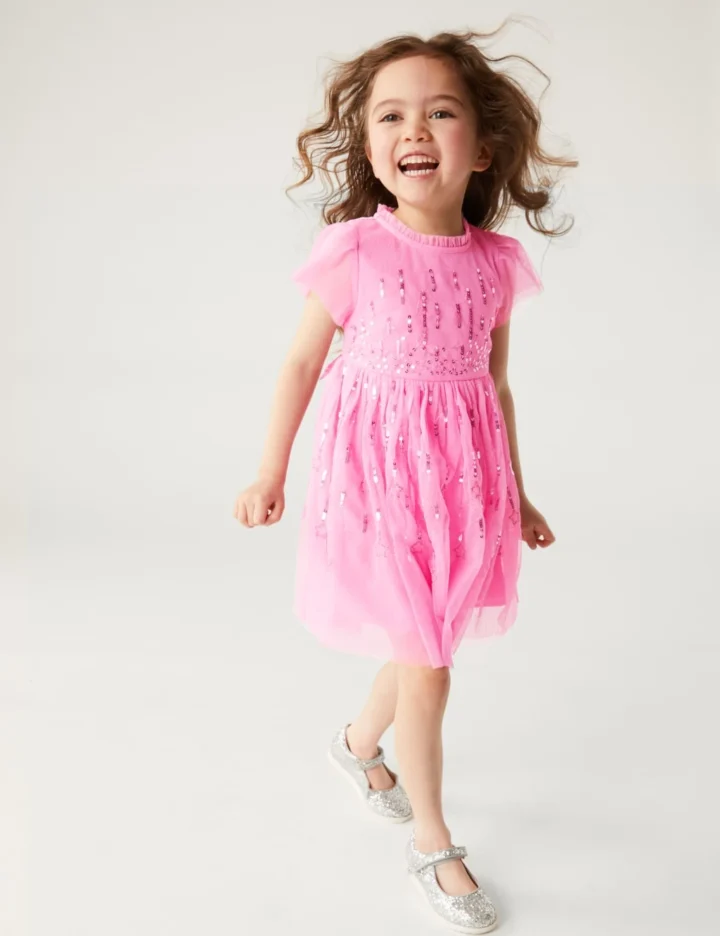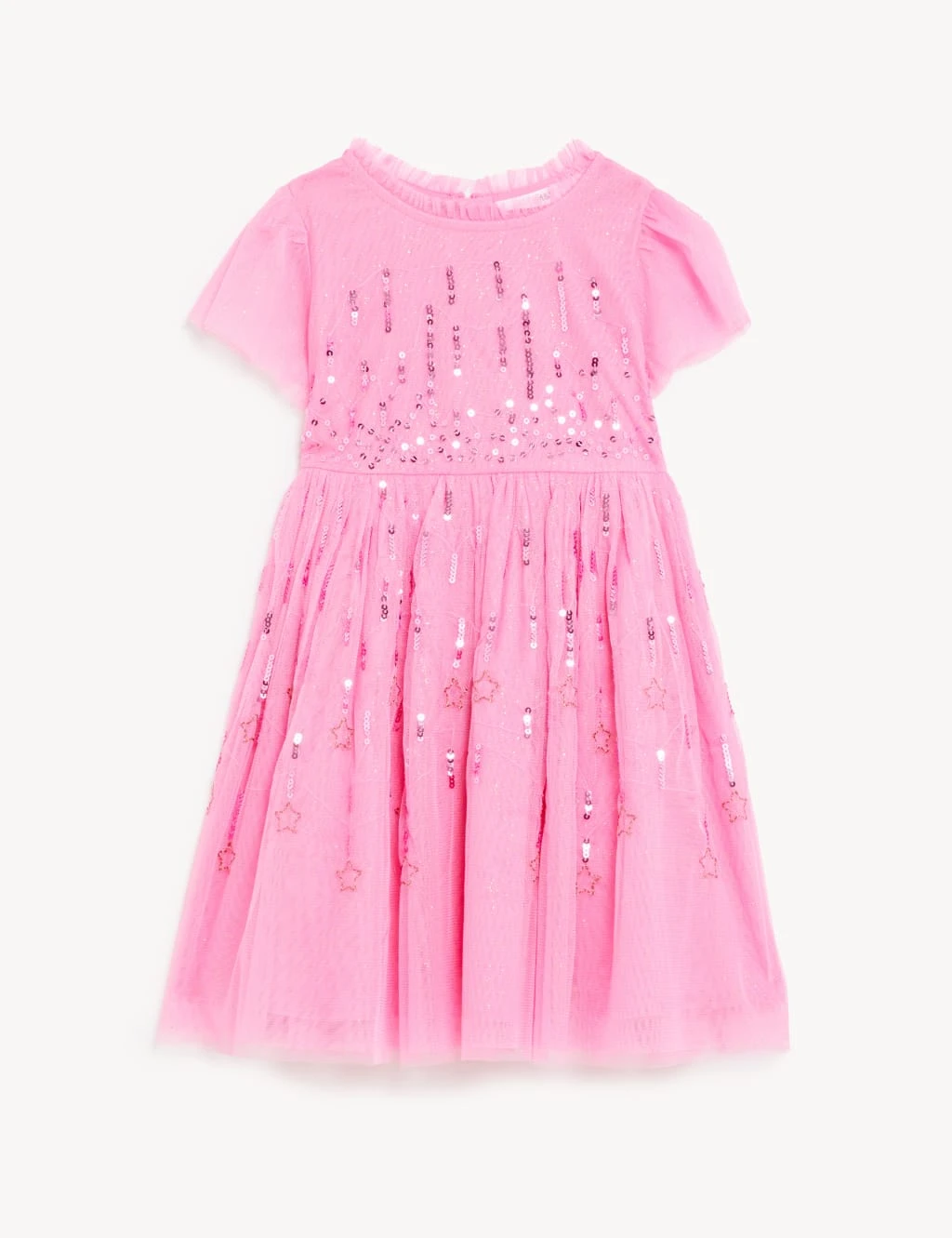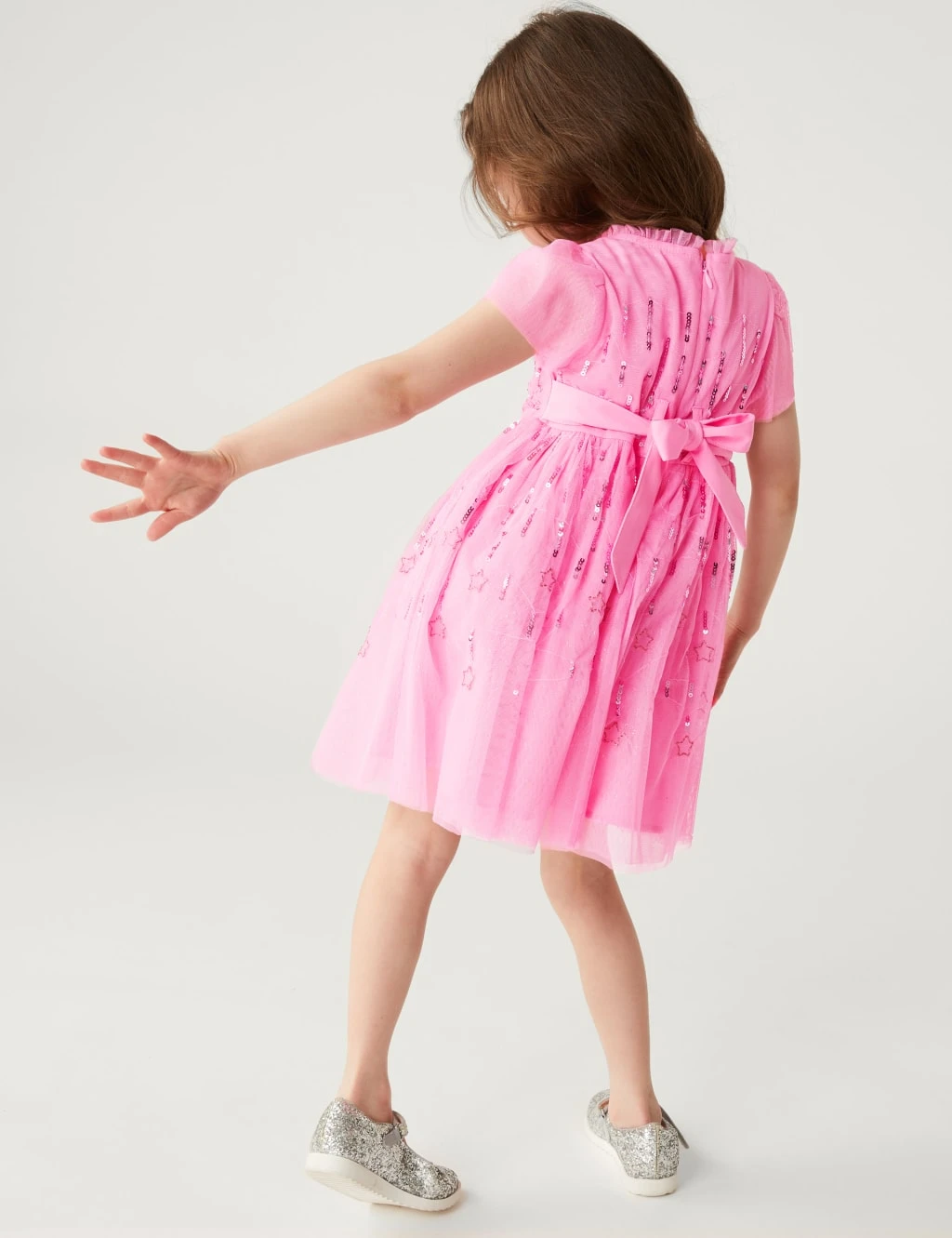 Special occasions call for this showstopping tulle dress. Comfy regular fit with short sleeves and a round neck. Fastens with an easy zip fastening. Decorated with embroidered stars and sequins for a touch of sparkle and finished with a playful bow at the back.