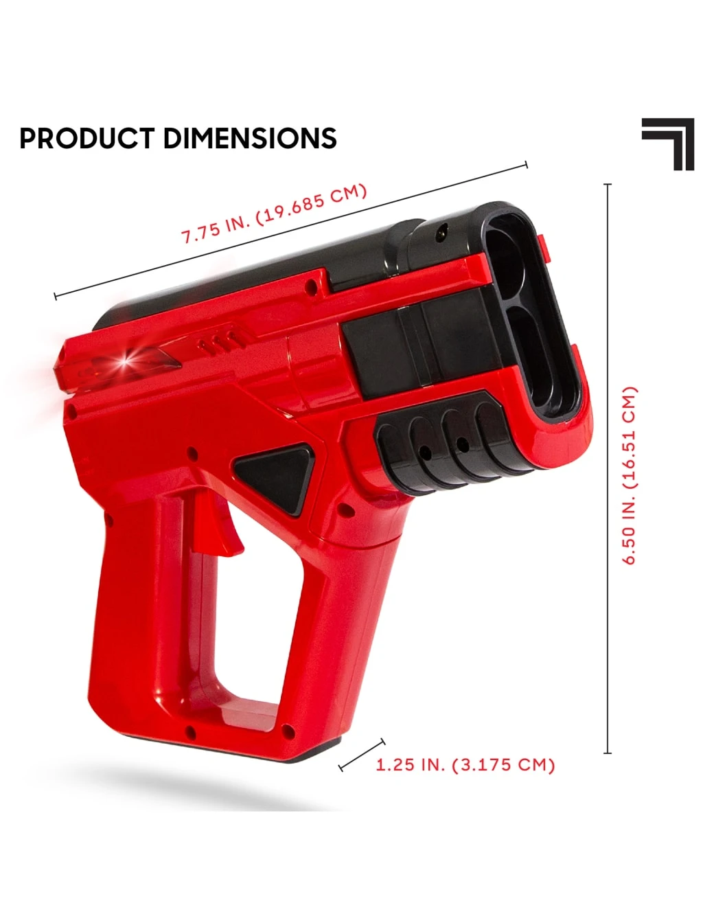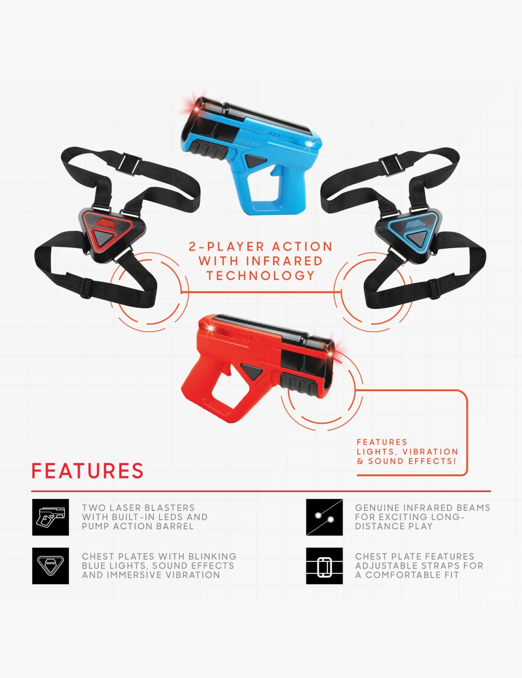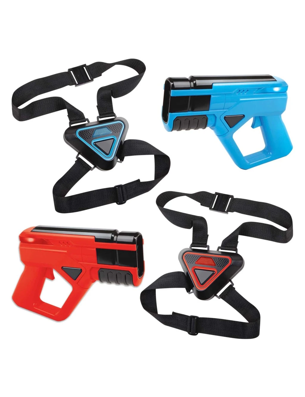 Each gun blaster and vest lights up, makes sound effects, and vibrates with various in-game actions. Feel like you are in a real arcade arena with immersive sound and visual effects, and even try a game in dim light or at night-time! Multiple sets are compatible with each other, so you can combine as many sets as you want to add as many players as you want! Turn your laser tag arena experience into a true battle royale.