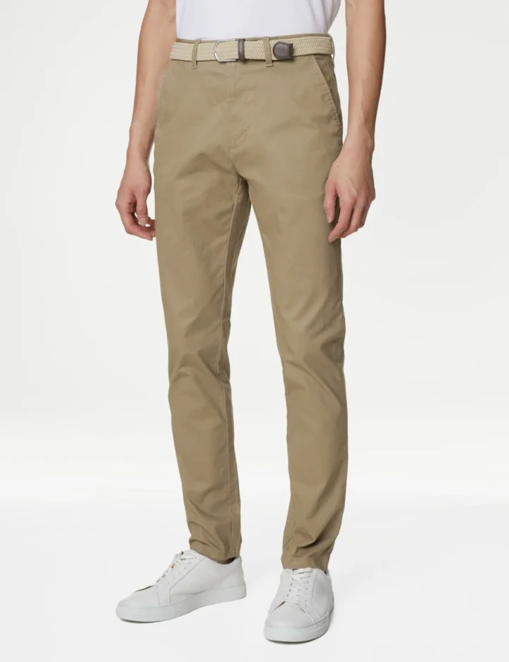 These classic cotton-rich chinos will add a smart edge to laid-back days. Cut to a streamlined slim fit, with added stretch for extra comfort. Handy side pockets add a practical finish. Includes a timeless woven belt.