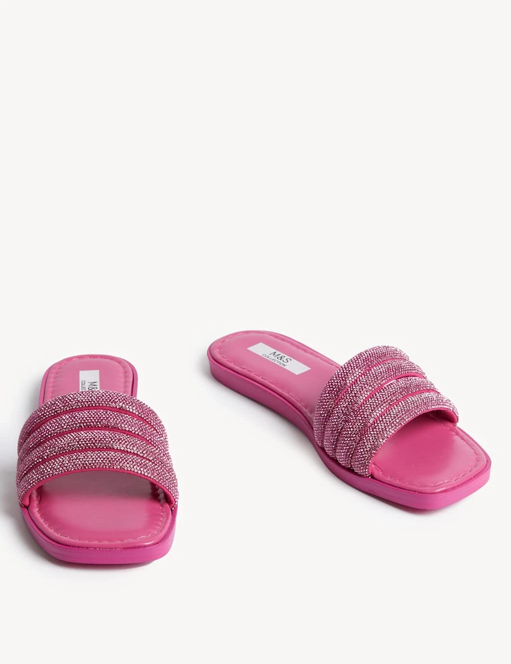 Slip on these sparkly mules to instantly elevate off-duty outfits. They’re designed with four bands across the toe and a flat heel for comfortable wear. These shoes are vegan.