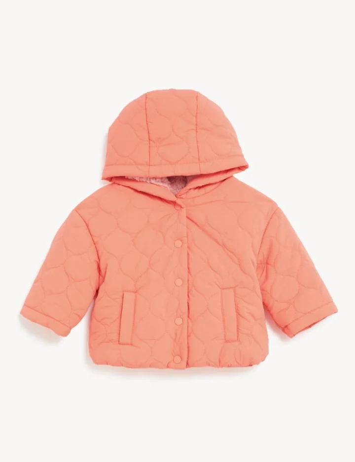 Keep little ones warm and dry in this cosy quilted coat. The snug hooded design is lined with soft borg and features handy popper fastenings. It also has a water-repellent finish, thanks to our Stormwear™ technology.