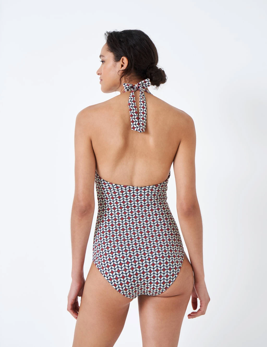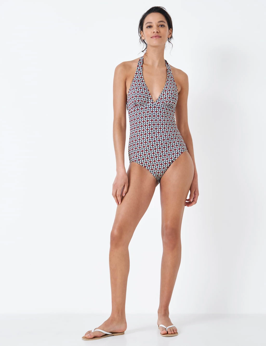 Make a stylish splash at the beach or pool in this eye-catching halterneck swimsuit by Crew Clothing. Designed with a flattering v-neckline, it features padded cup inserts for comfortable support. The bold stripes exude a timeless nautical charm, while the elegant tie fastening ensures a perfect fit.