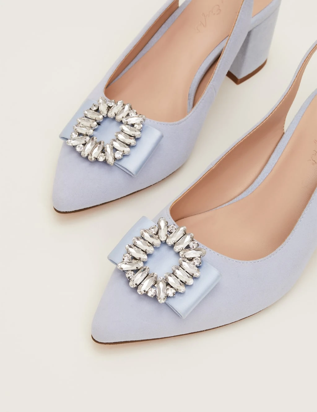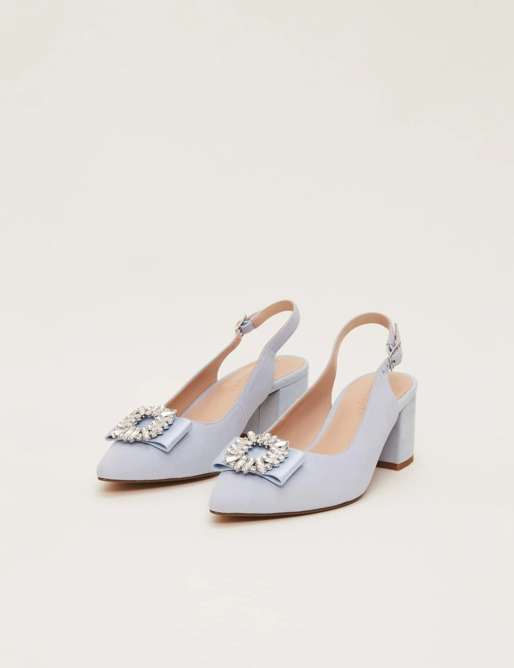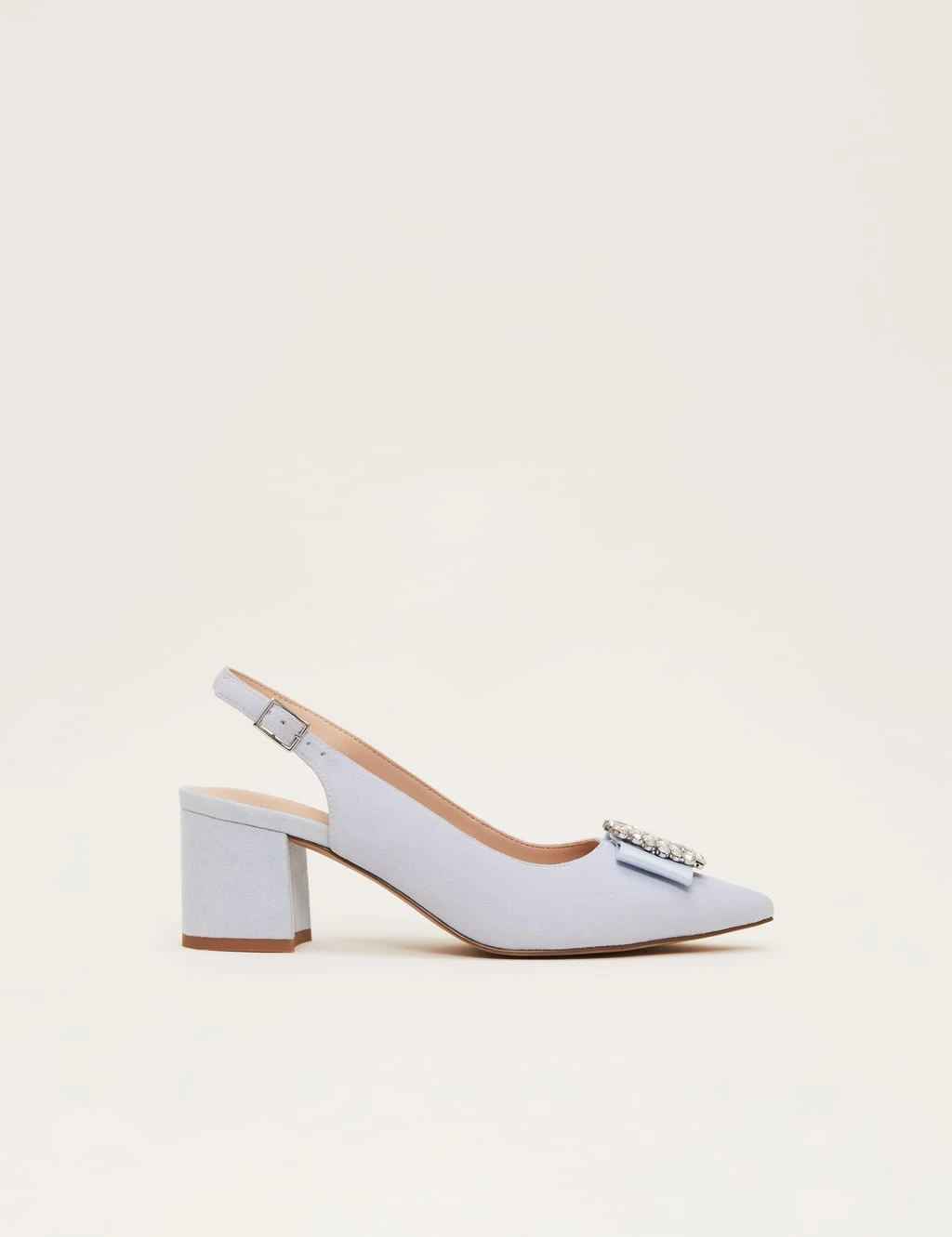 These Phase Eight shoes are the perfect party pair, designed with suede fabric and a jewel detail for a luxuriously elegant look. They come in a dainty slingback style with buckles on the ankle straps for an adjustable fit. The pointed toe creates a sleek silhouette, while their sturdy mid-block heel gives lift and stability.