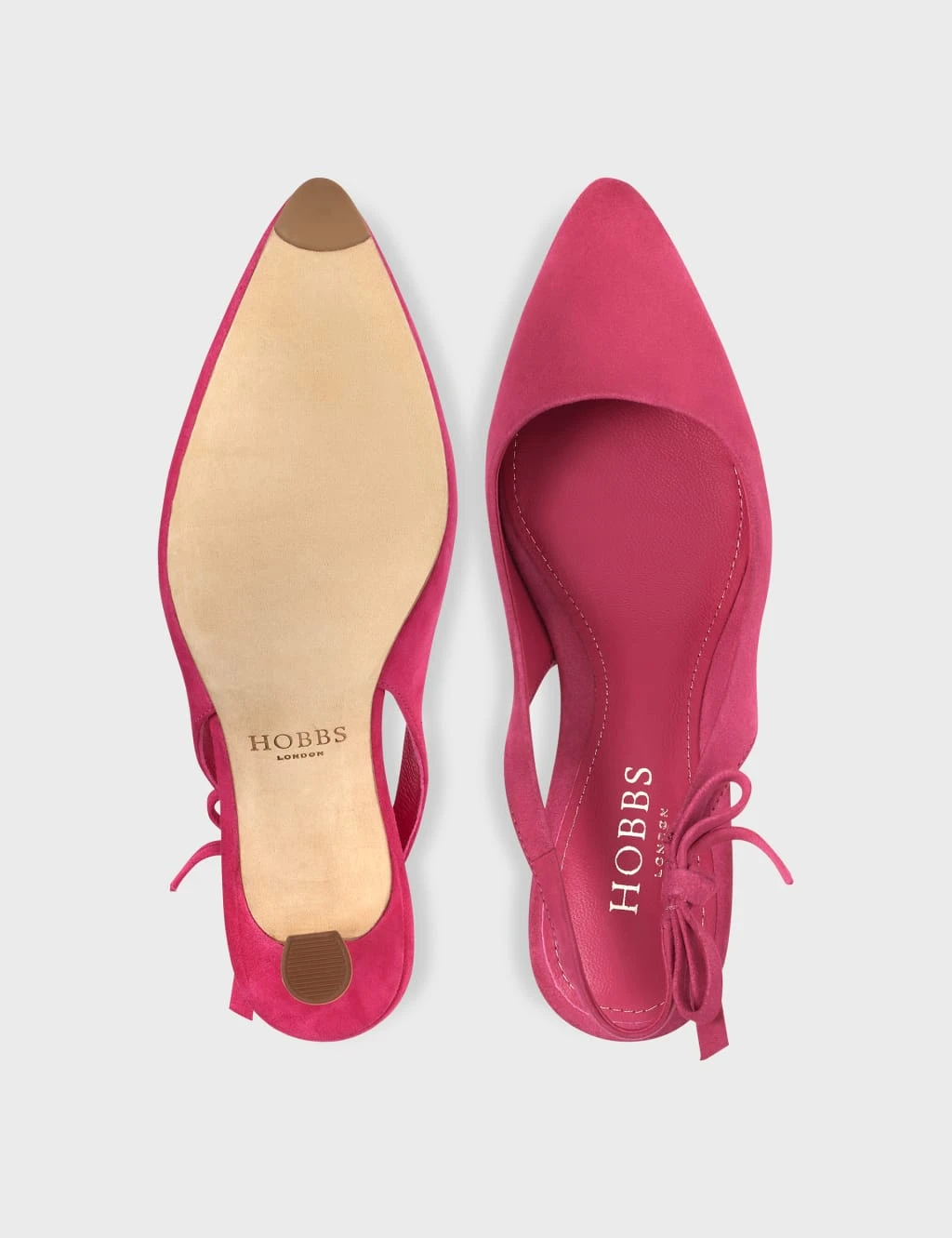 These suede shoes from Hobbs can be matched with both daytime and evening looks. The slip-on slingbacks feature a mid-height kitten heel and an elegant pointed toe. Complete with structured bows on the straps, they’re a feminine pair to add to your collection.