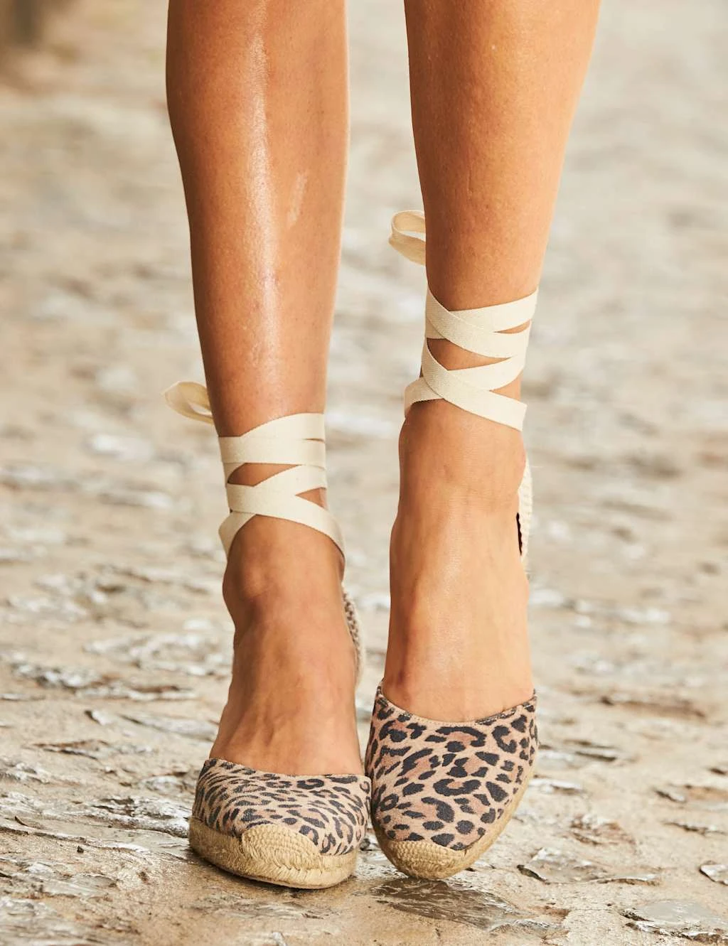 Playful leopard print brings a statement feel to these suede espadrilles from Sosandar. They’re designed with a comfortable mid-height wedge heel with traditional rope detailing. An elegant ribbon tie at the ankle gives a feminine finish.