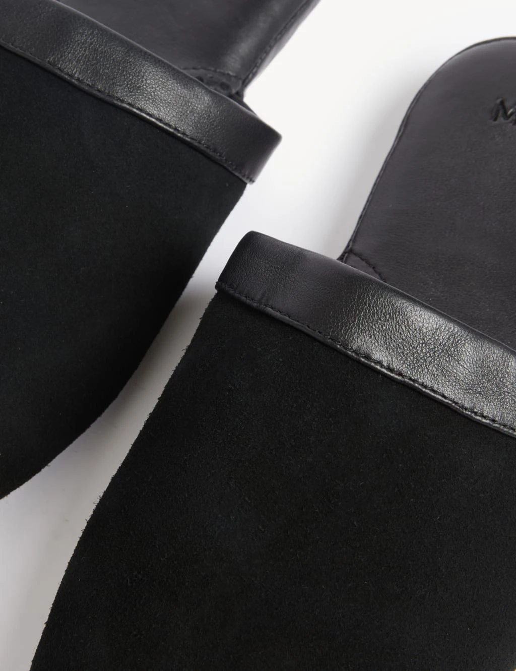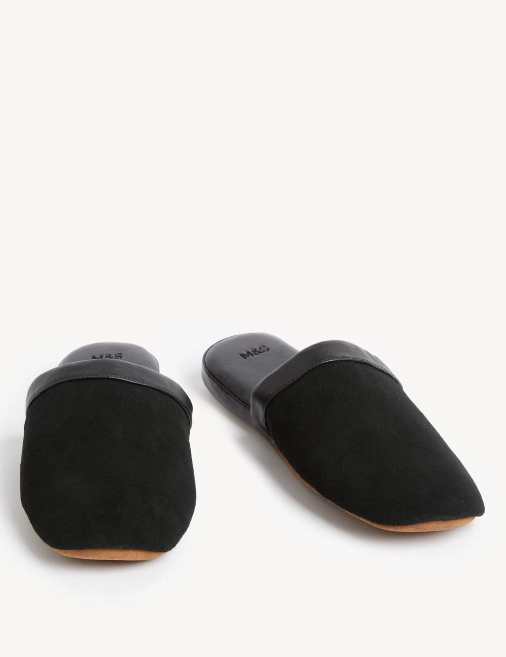 Soft suede adds a luxe appeal to these classic slippers. Backless mule-style design for a timeless look.