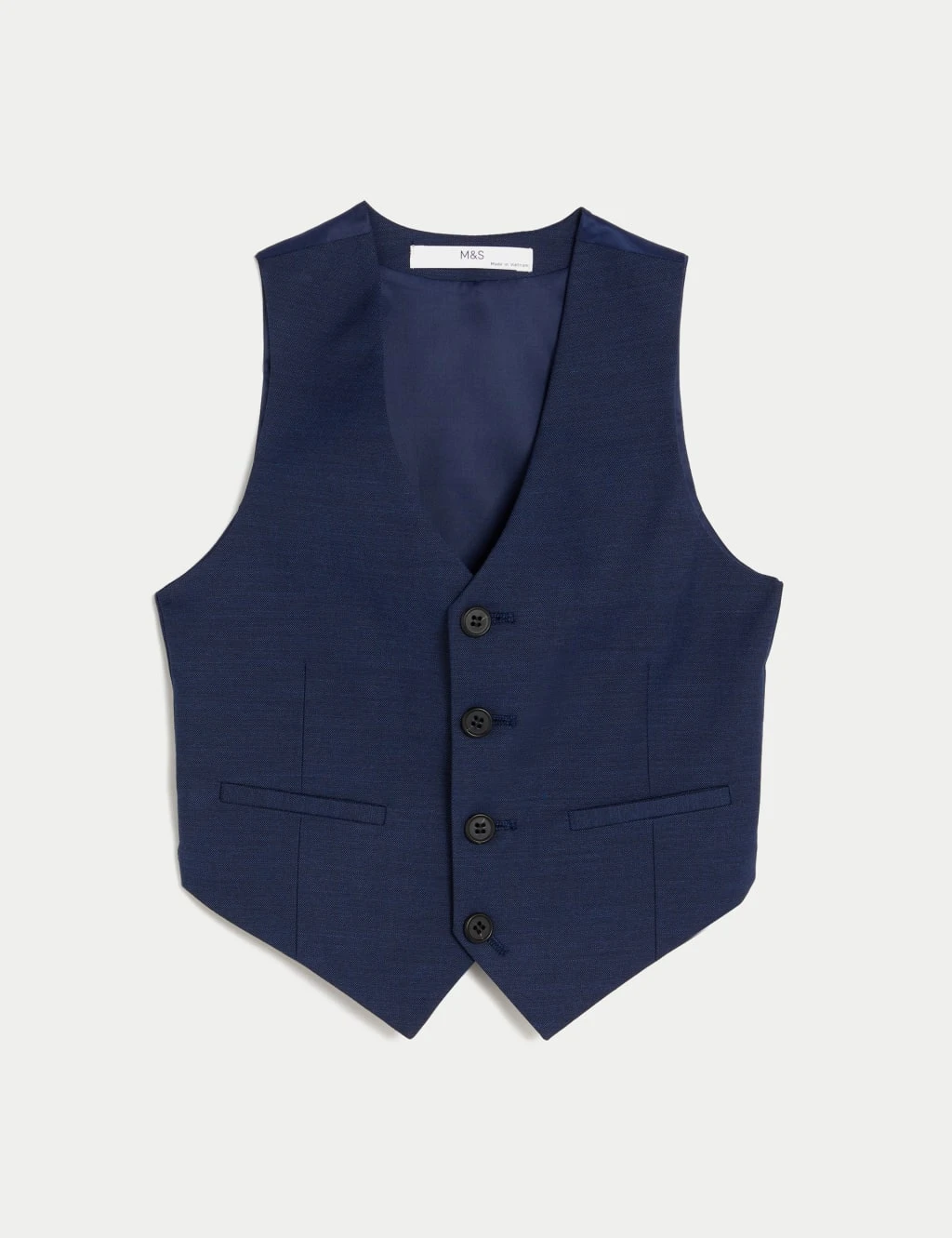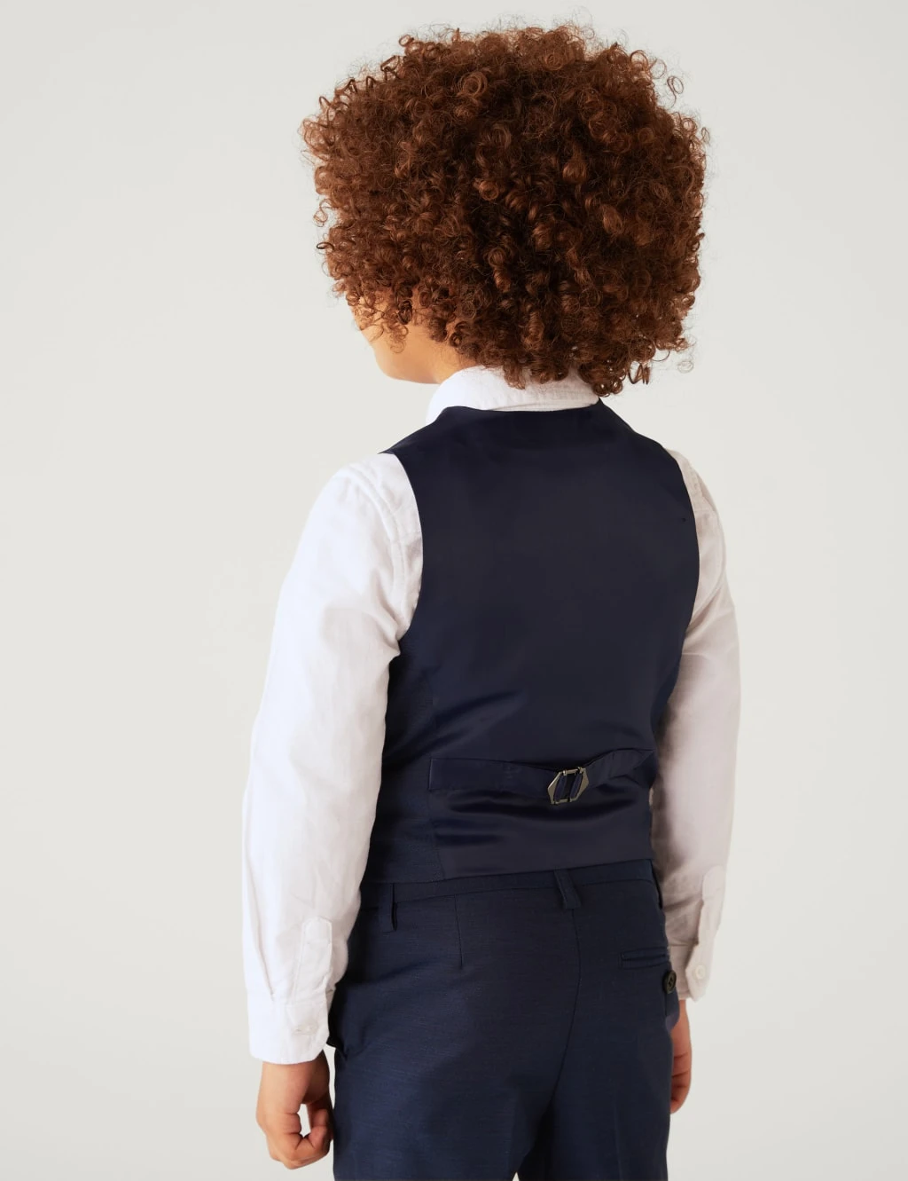 This suit waistcoat is from our Mini Me range, so there’s a matching adult version available in the menswear collection. It’s cut to a regular fit with a full lining and a neat v-neck. Added stretch helps to keep its shape. Traditional details include a row of matching buttons and pocket details.