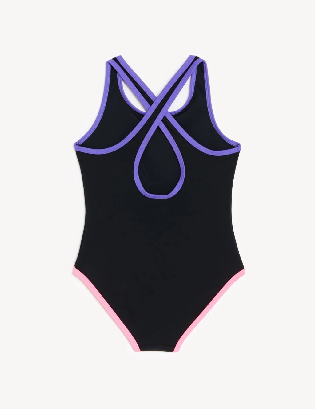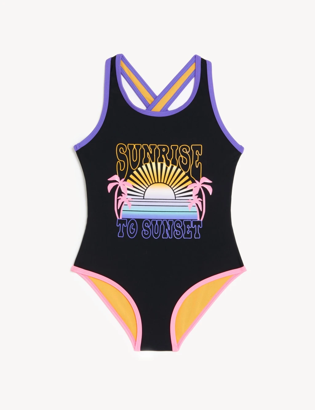 Bring on beach days with this cool swimsuit. Comfy regular fit, with plenty of added stretch for ease of movement. Chlorine-resistant fabric ensures long-lasting quality. Sun Smart UPF50+ technology helps protect skin against harmful UV rays. Endorsed by the British Skin Foundation. The front features the slogan ‘Sunrise to Sunset’ and a retro-inspired palm and sun graphic.