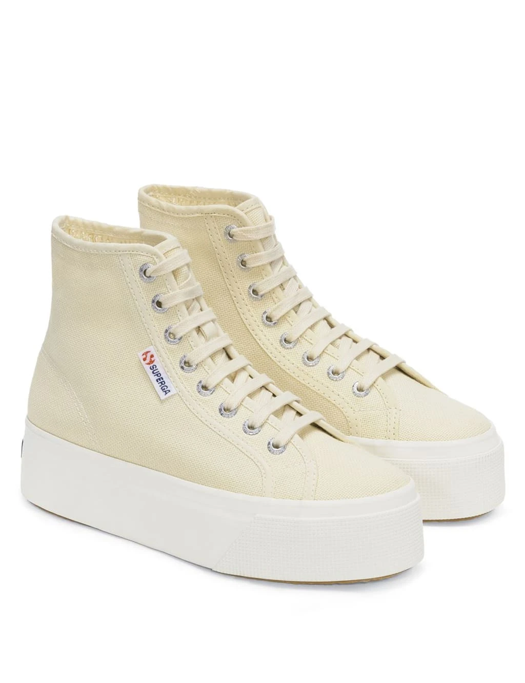 Create a chic athleisure look with these canvas high top trainers from Superga. They’re designed with a classic lace-up front and on-trend eyelet detailing. Chunky flatform soles offer all-day comfort with an added lift. The Superga tab on the side makes for a stylish finishing touch.