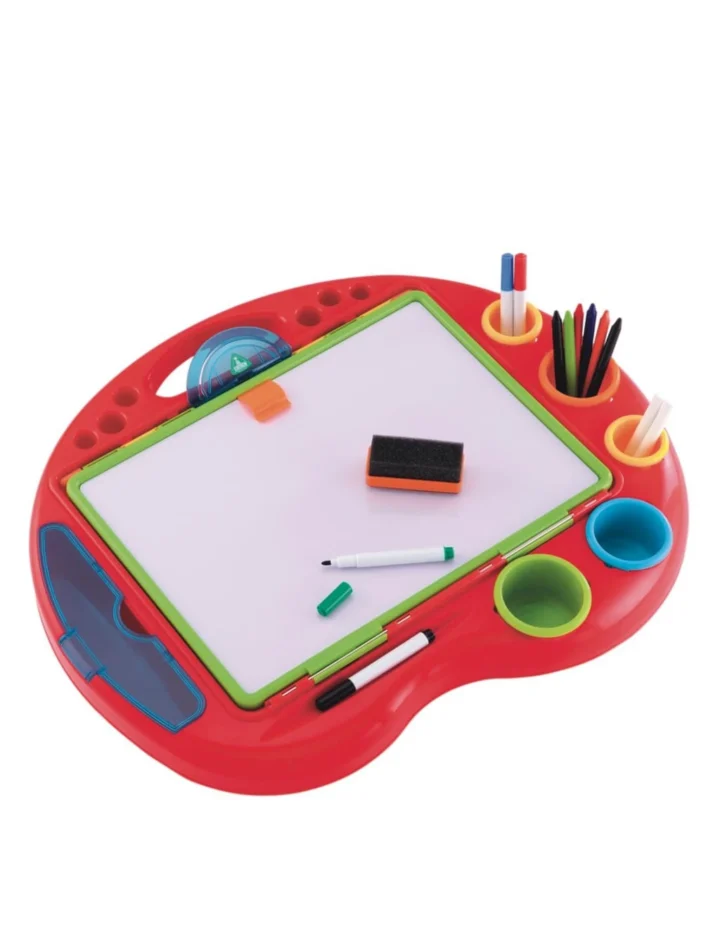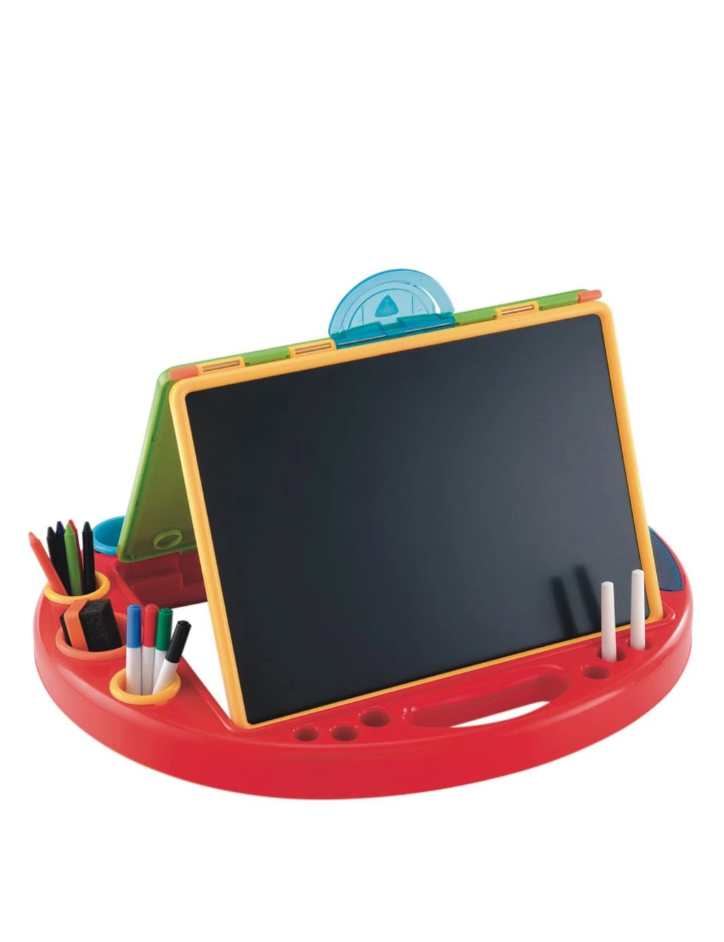 Unleash your child’s creativity with this tabletop art centre from Early Learning Centre. Double-sided board features a wipe-clean whiteboard on one side and a chalkboard on the reverse. Lay it flat in the base, or stand up for a traditional easel look. Kit also contains sheets of paper and board clips to create more permanent artworks. Complete with chalks, crayons and whiteboard pens. Awesome arts and crafts for 3 and over.