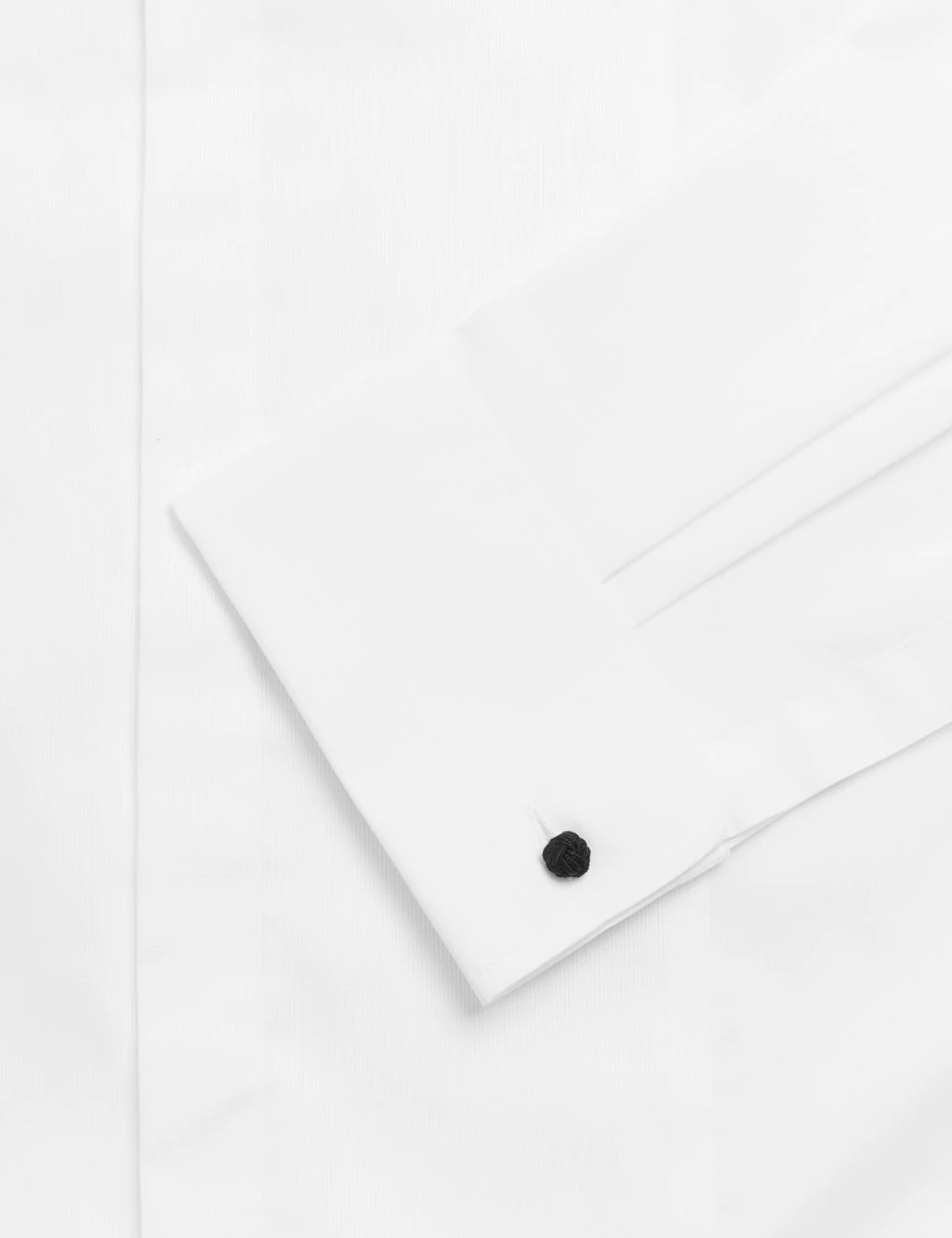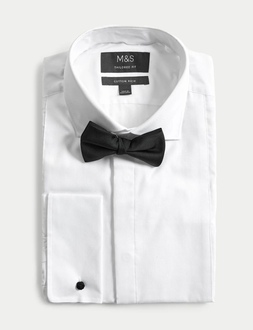 Dressing for the occasion is effortless with this cotton-rich dinner shirt and bow tie set. The shirt has a tailored fit which is complemented by the double cuff detail and cutaway collared neck. The bow tie is pre-tied and adjustable so you can create a smart look with ease.
