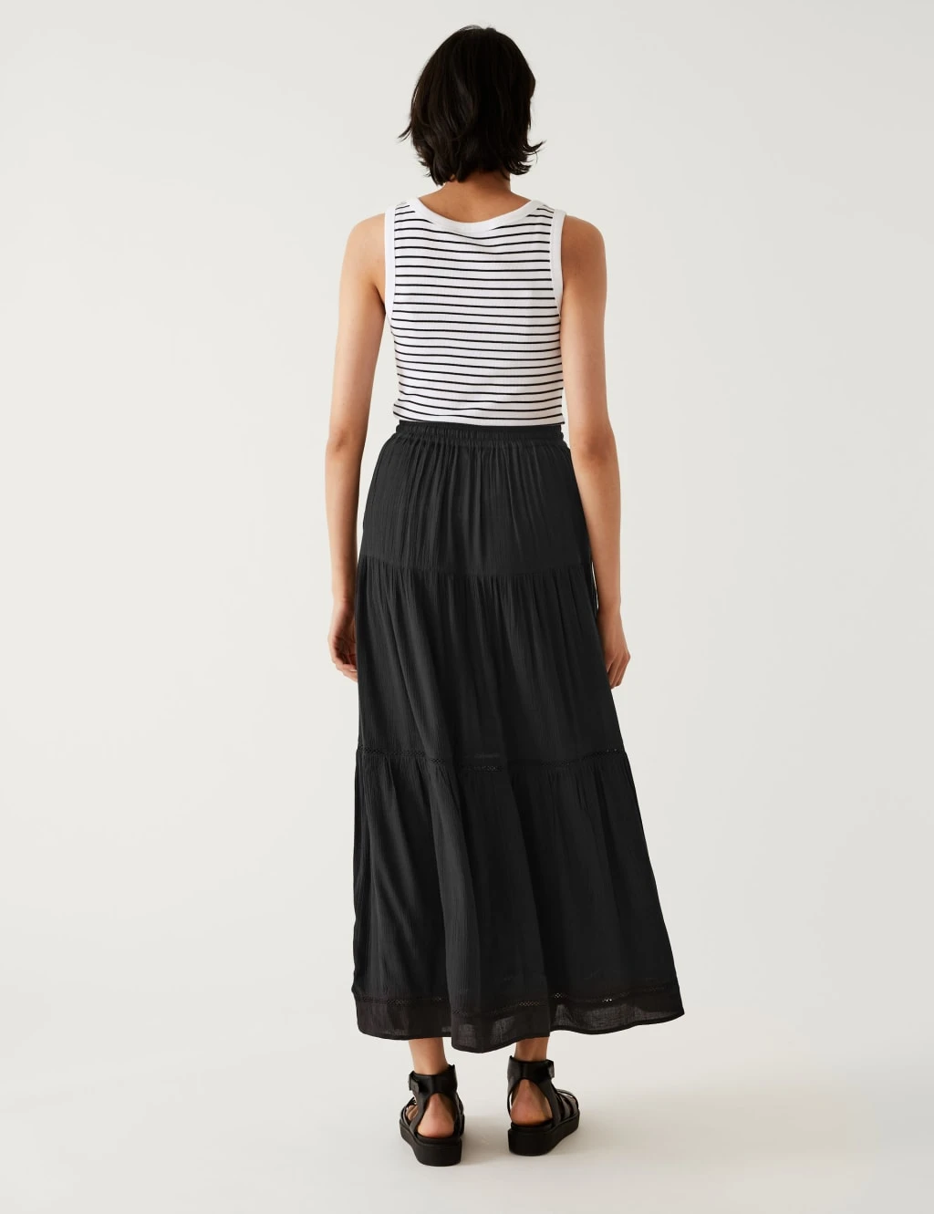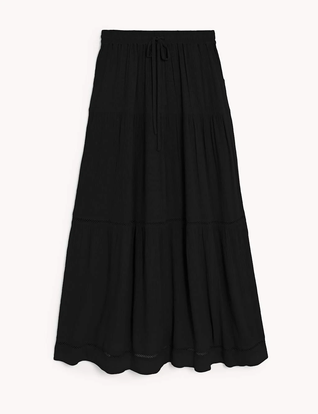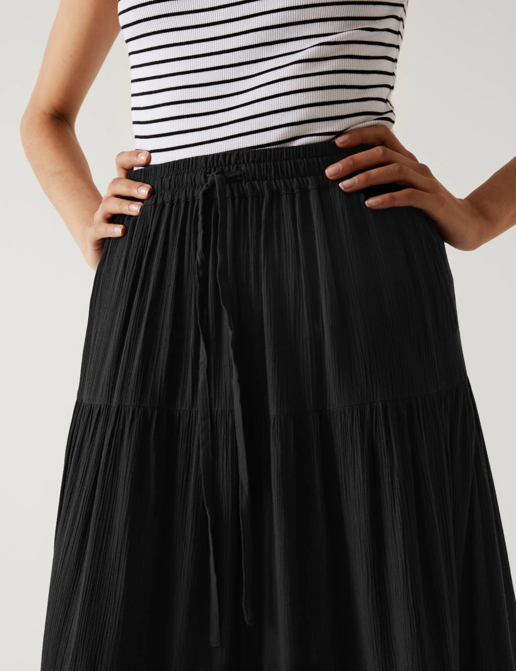 This midaxi skirt is crafted with lace details on the tiers for an elegant flourish. The flattering high waist features a drawstring tie and is elasticated for comfort. Crinkle fabric offers a casual textured effect. This piece is complete with two practical side pockets.