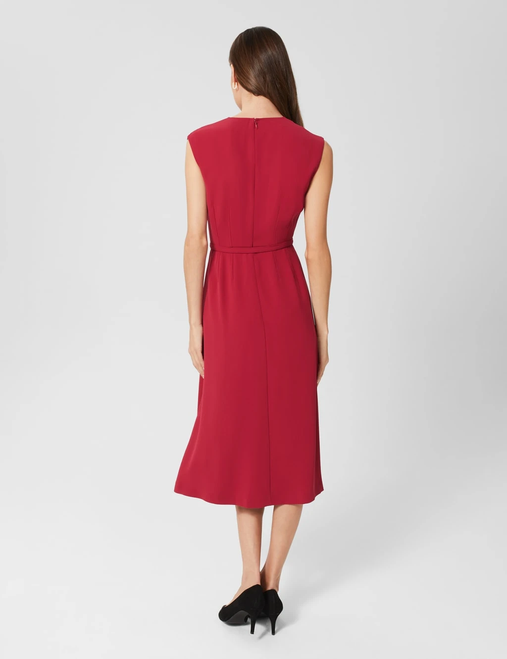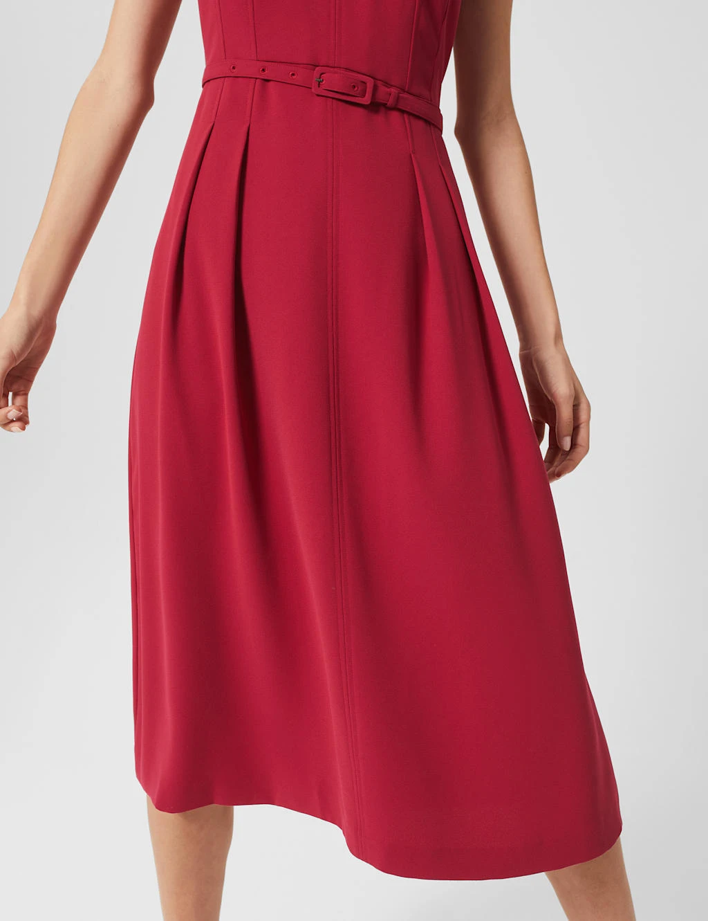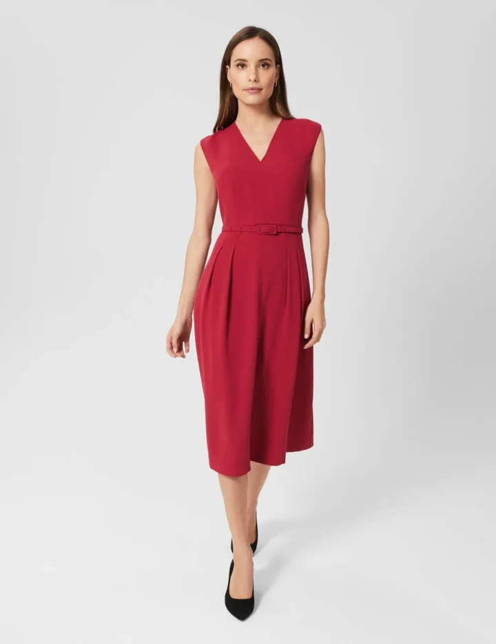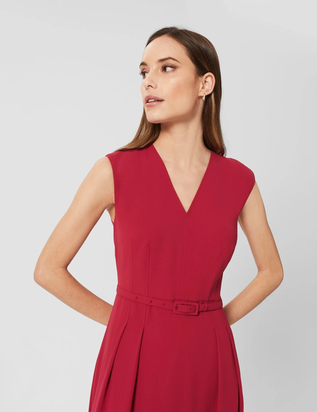 This midi dress from Hobbs has an elegant waisted shape, enhanced by the matching belt. It’s cut to a regular fit, with a closer-fitting bodice opening out into a fuller skirt. Darts above and below the waist emphasise the classic hourglass style. The sleeveless design is echoed by the deep v-neck and fastens at the back with a discreet zip.