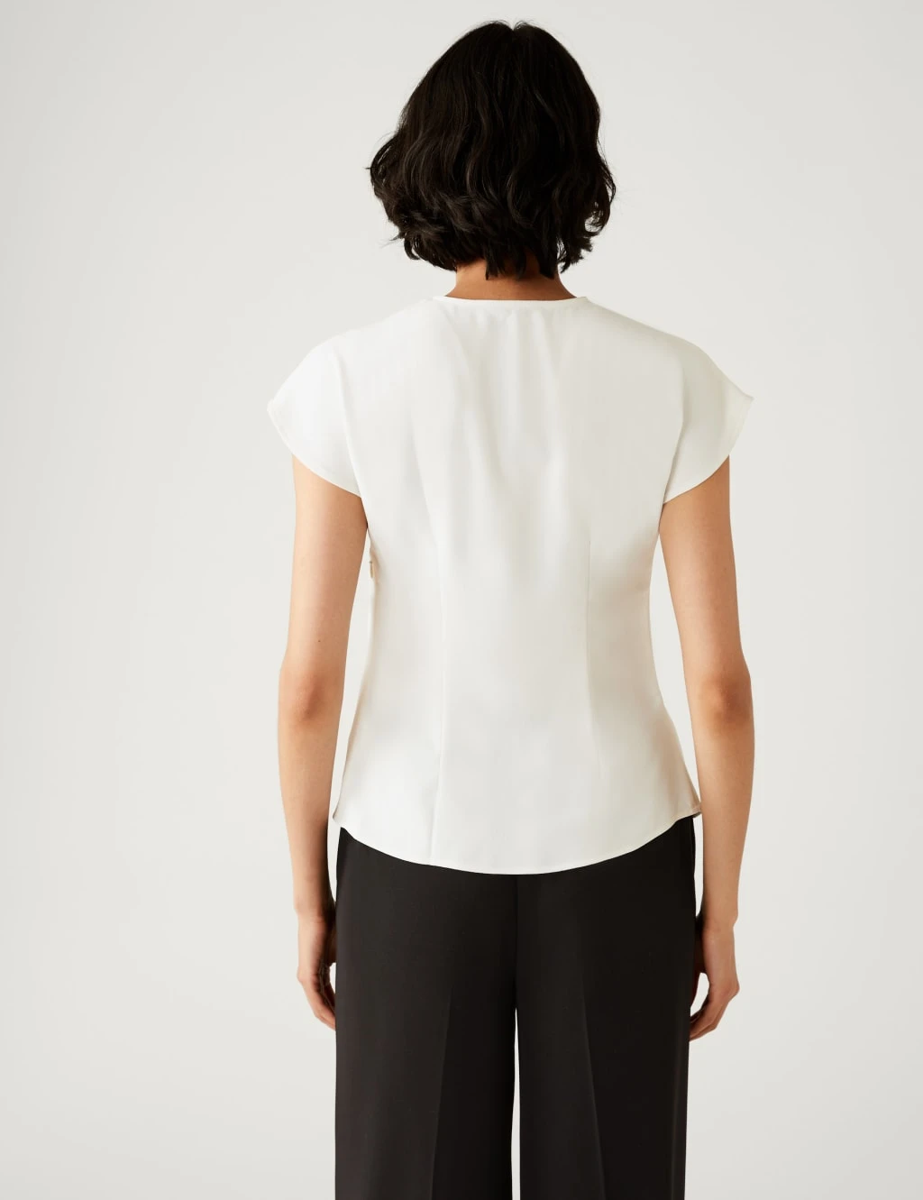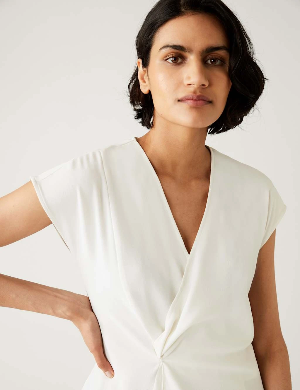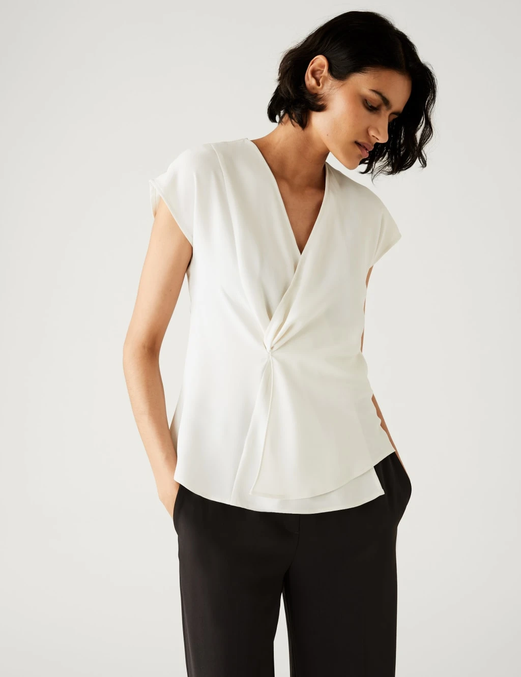 Elevate your wardrobe with this elegant sleeveless blouse. It’s cut to a comfy regular fit and features a feminine deep v-neckline. This piece is finished with a knotted front that adds sophisticated detail to the simple design.