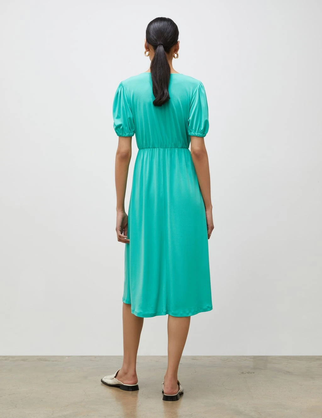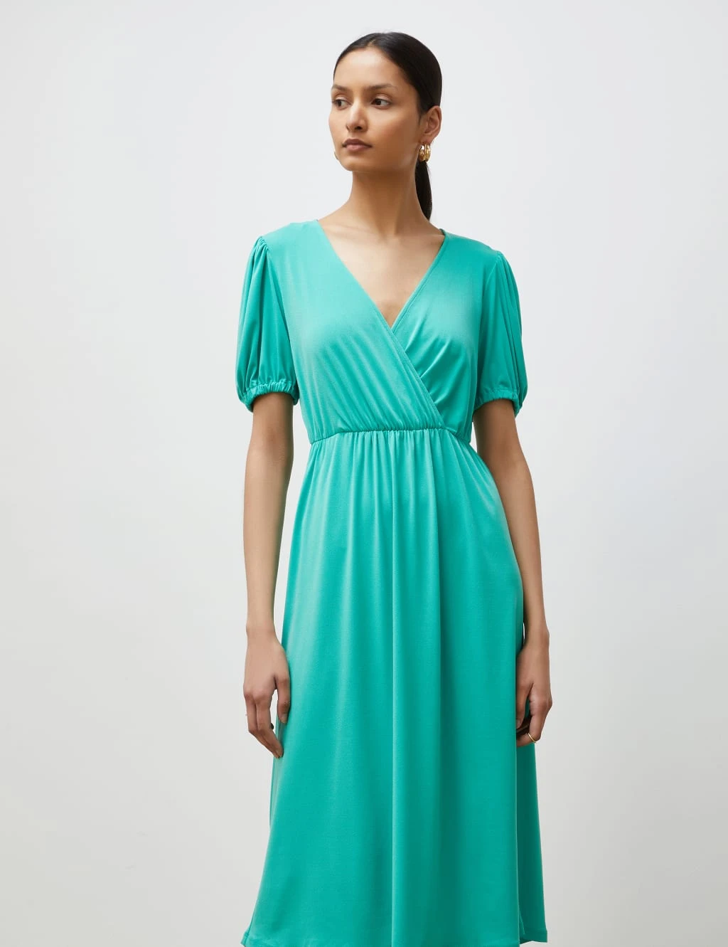 This waisted midi dress from Finery London is easy to dress up or down. It’s designed in a regular fit, with a mock-wrap v-neckline and short puff sleeves. Gentle gathering at the waist creates an elegant draped finish through the bodice and skirt.