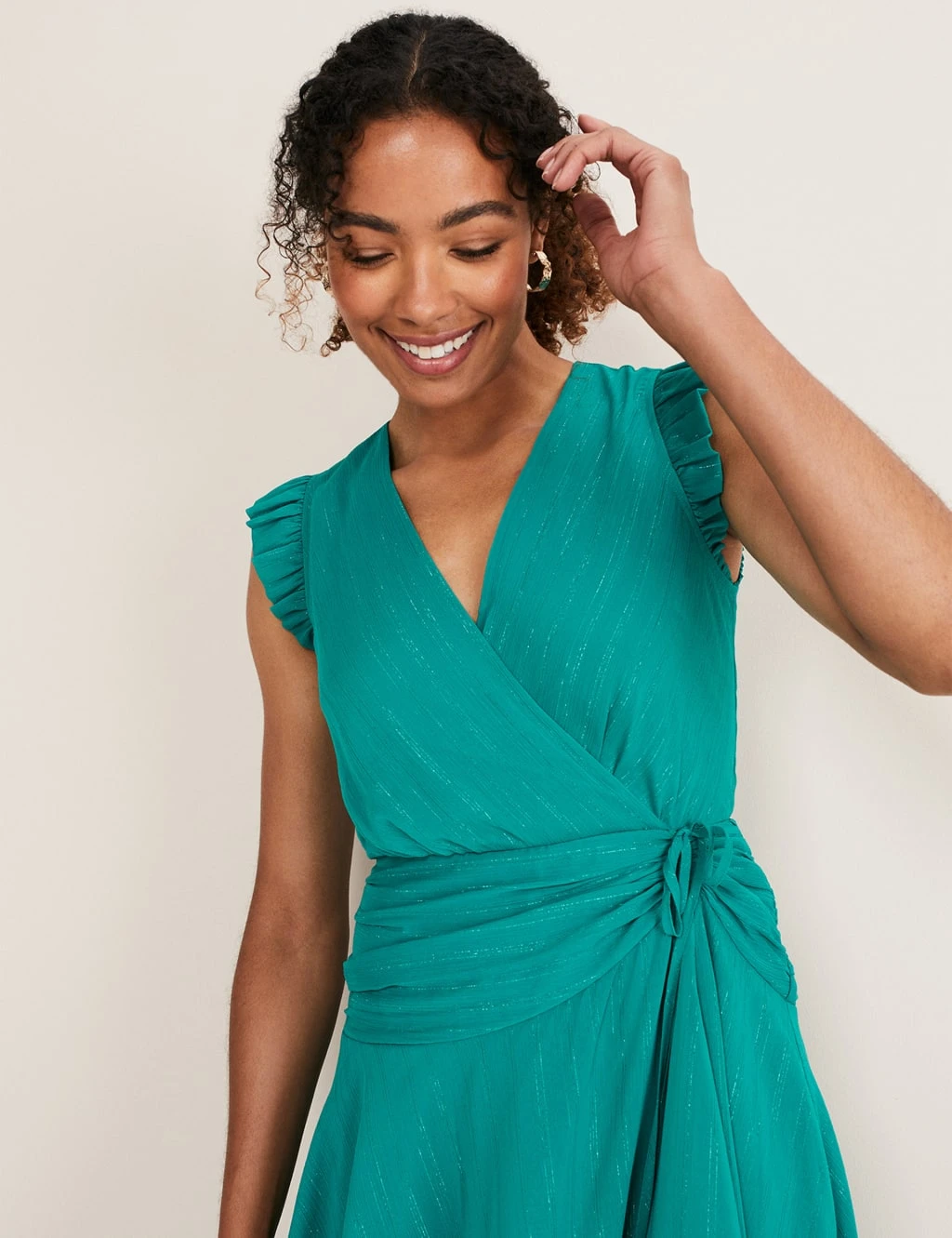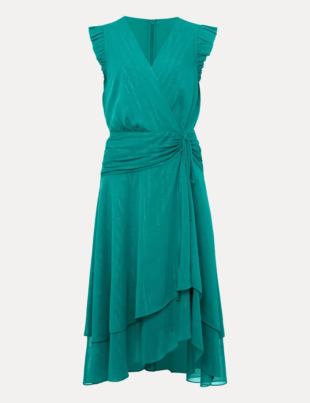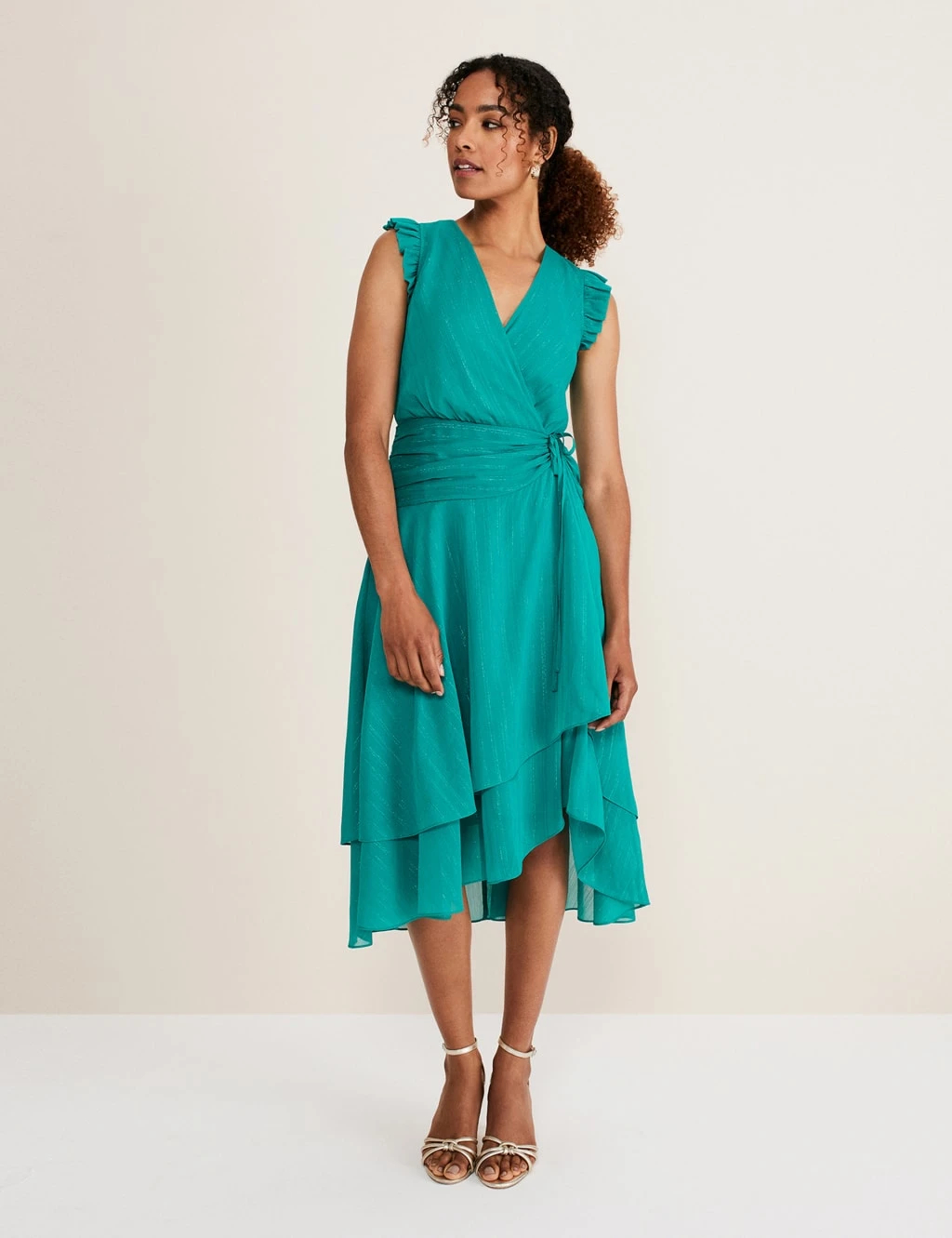 It’s all in the details with this wrap dress from Phase Eight. Cut to a regular fit with a v-neck, the flattering sleeveless style features a ruched tie at the waist to define your silhouette. Ruffle detailing at the shoulders and the knee-length hemline finishes the feminine look. Made with recycled polyester.