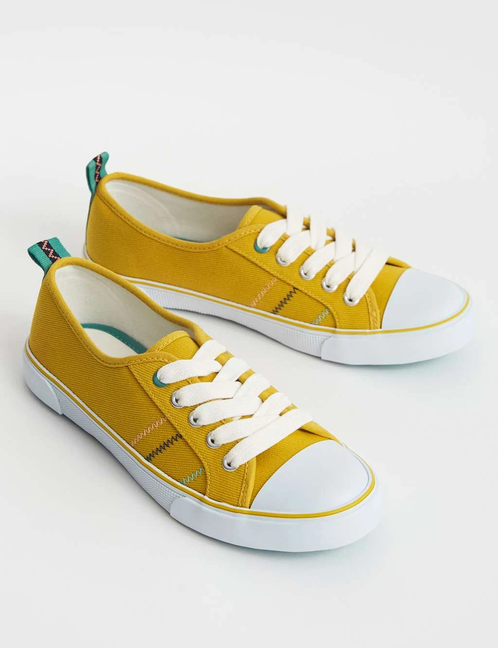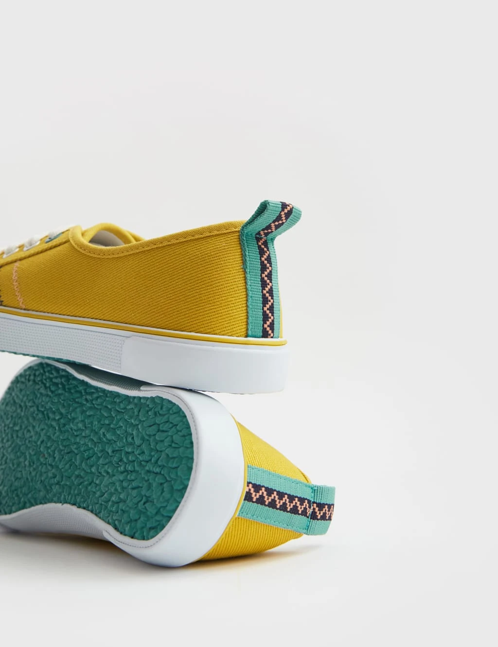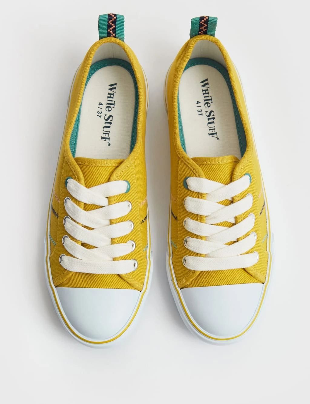 Bring extra cool to your casual outfit with these canvas pumps from White Stuff. They’re made in a comfortable standard fit, with a flat sole and an easy lace up style. Contrast embroidered heel tabs add a fresh pop of colour that’s matched by the grippy rubber outsoles. Zig-zag stitching provides a fun finishing detail.