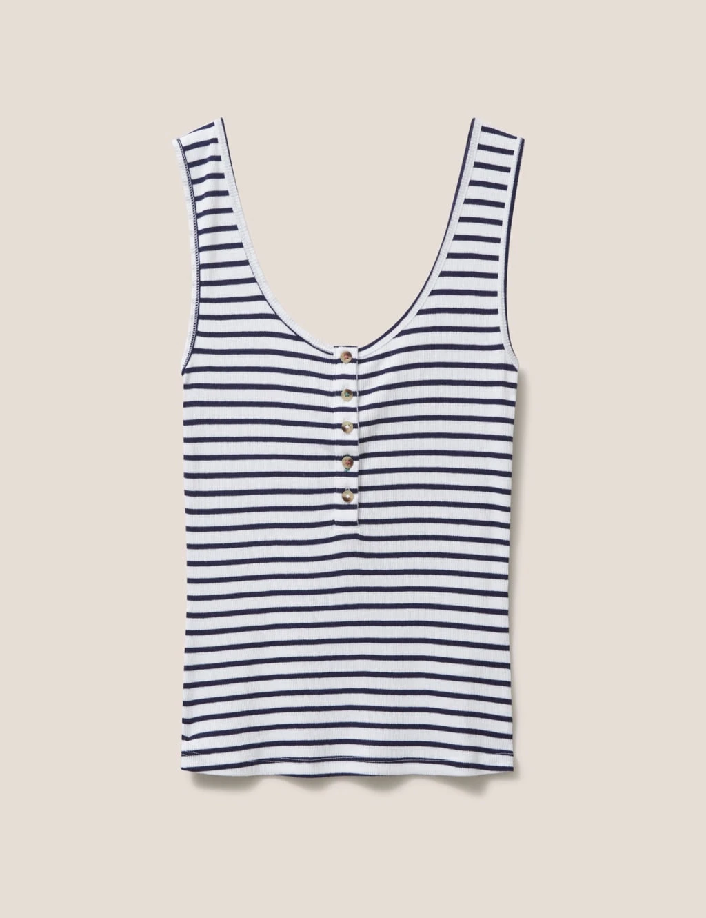 Nail nautical style with this cotton-modal striped vest top by White Stuff. It’s made in a comfy regular fit, with a scoop neck and back for a cool, airy feel. Colourful stitches add a playful twist to the mock-horn buttons on the half placket.