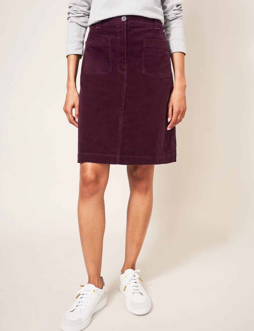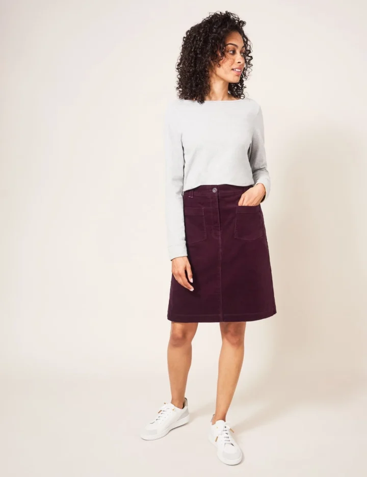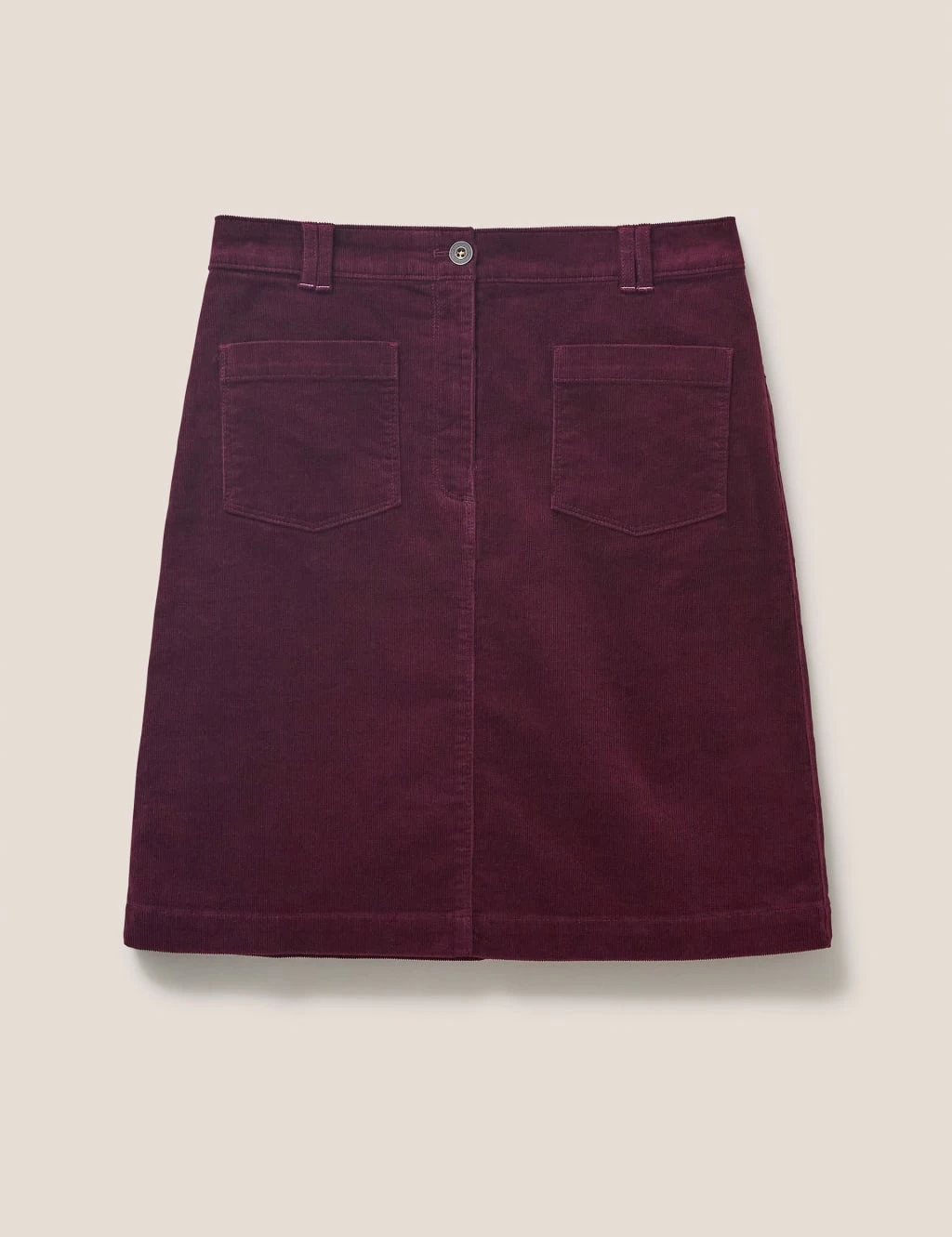 This versatile organic cotton-rich skirt from White Stuff will be the start of endless work and weekend outfits. Crafted from cord fabric for a cosy feel, this flattering A-line style has a knee-length hem and a covered zip and button fastening. Two patch pockets to the front add a relaxed finishing touch. Made with organic cotton.