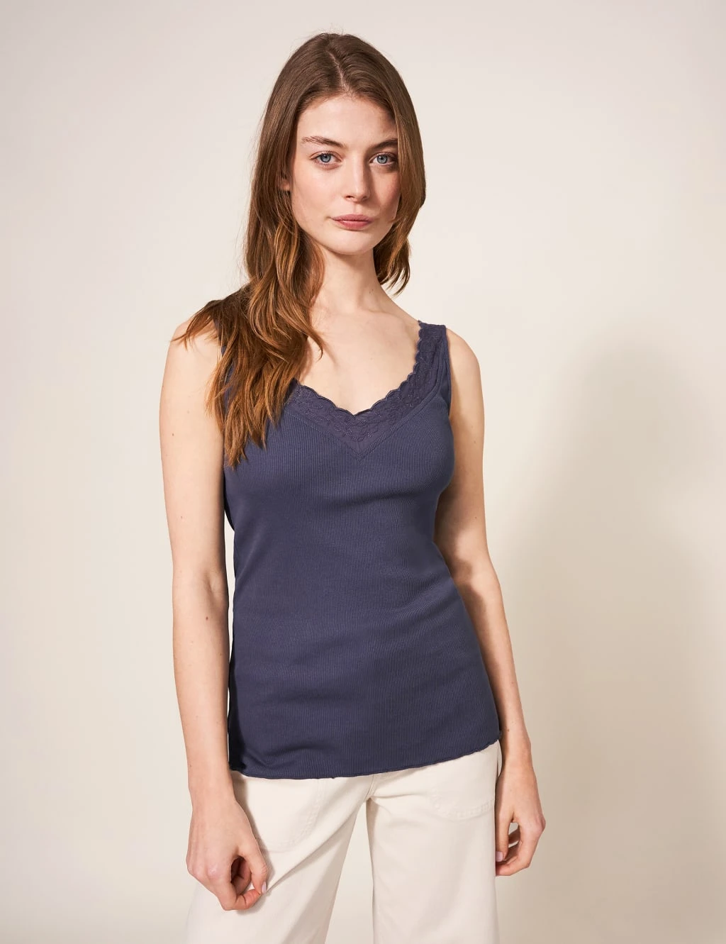 WHITE STUFF Pure Cotton Ribbed Lace Insert Vest