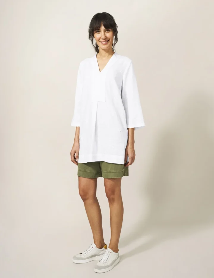 Serve up laid-back summer vibes in this pure linen tunic from White Stuff. It’s made in an easy regular fit, with a v-neck, wide three-quarter sleeves and a shirred panel at the back for extra shaping. Pretty tonal floral embroidery completes the design.