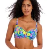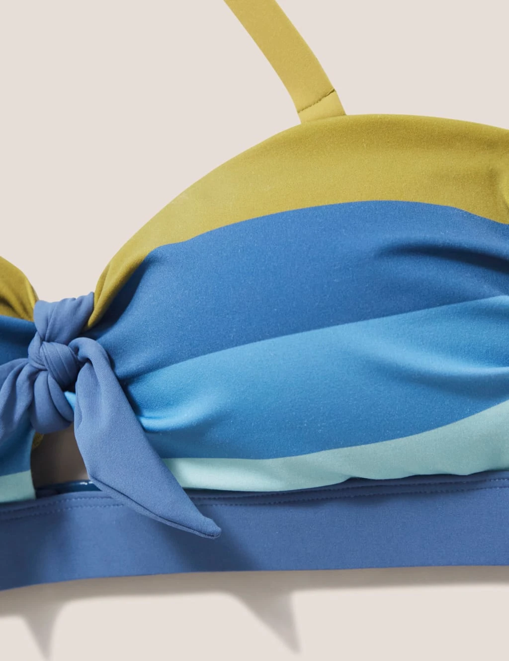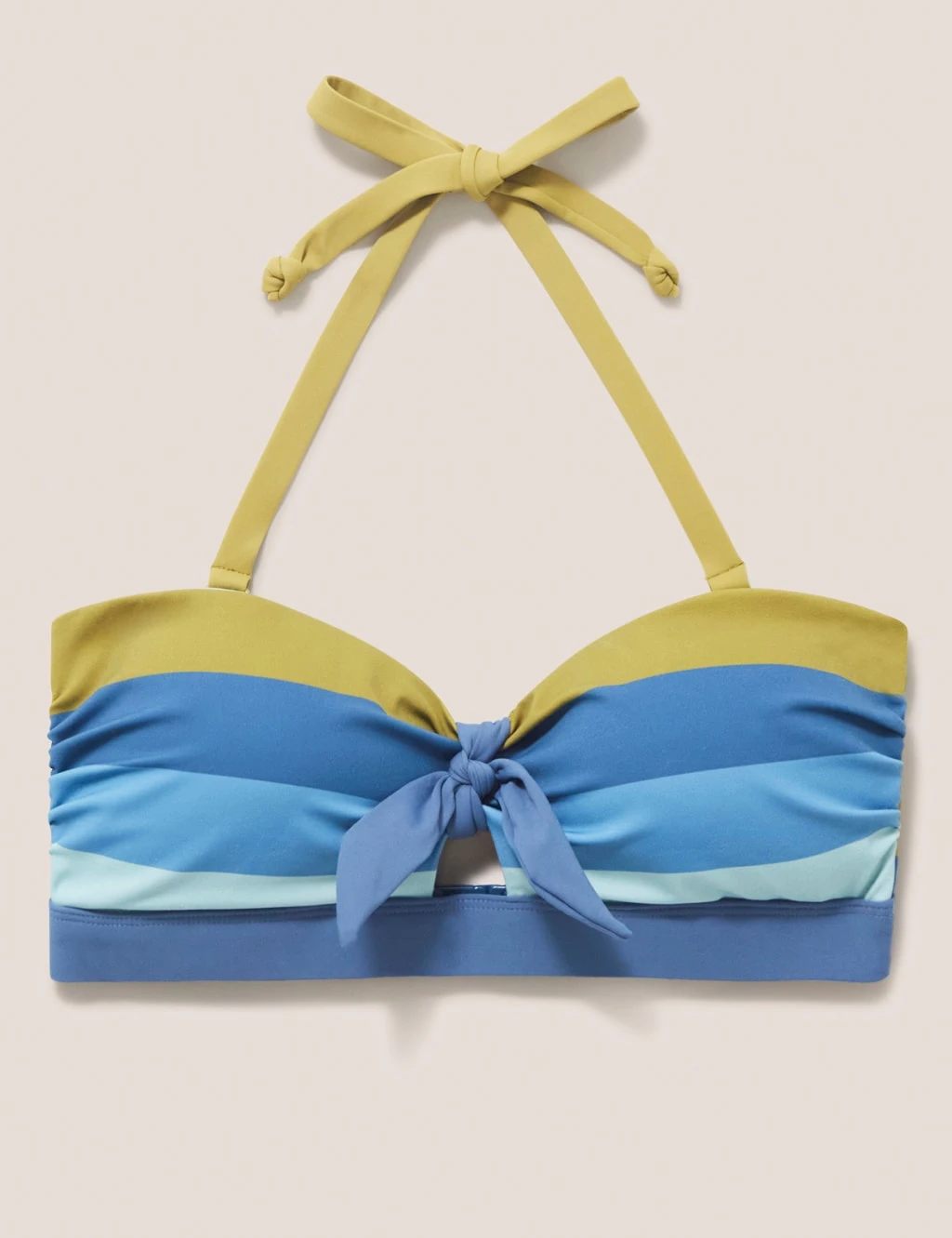 This bikini top from White Stuff has removable halterneck straps so you can also wear it in a classic bandeau style. Its soft unwired cups are padded for a smooth feel. Bold horizontal stripes add a fun pop, while a knotted tie-front and keyhole detail create a timeless look.