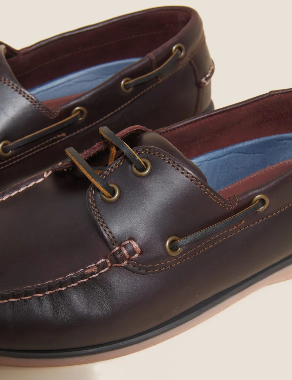 Add a dash of luxury to your weekend wardrobe with these leather boat shoes. Lace-up style in a wide fit for extra comfort. Contrast stitching completes the design.