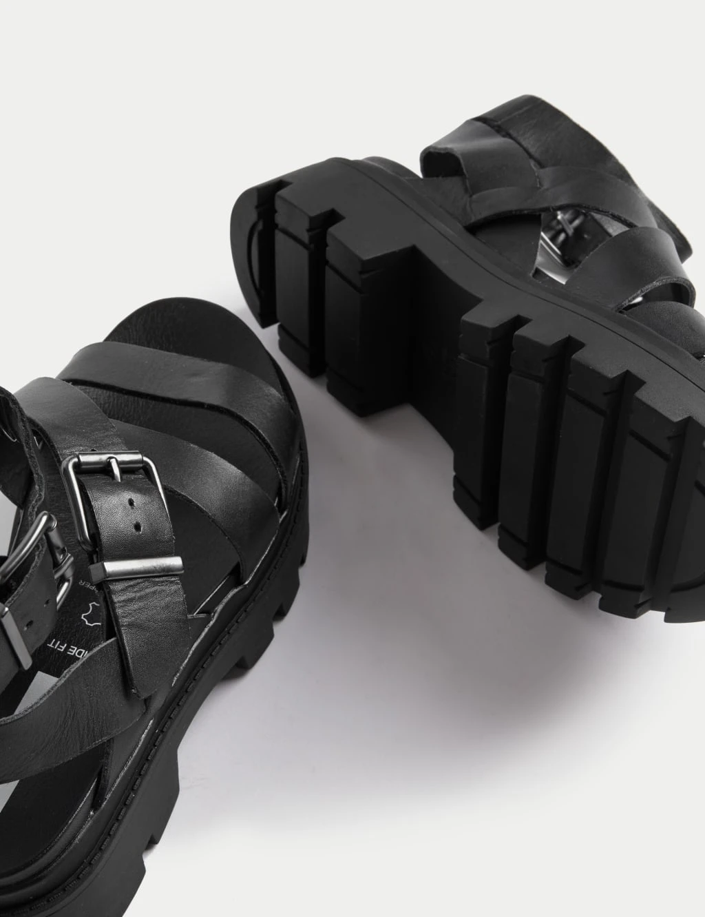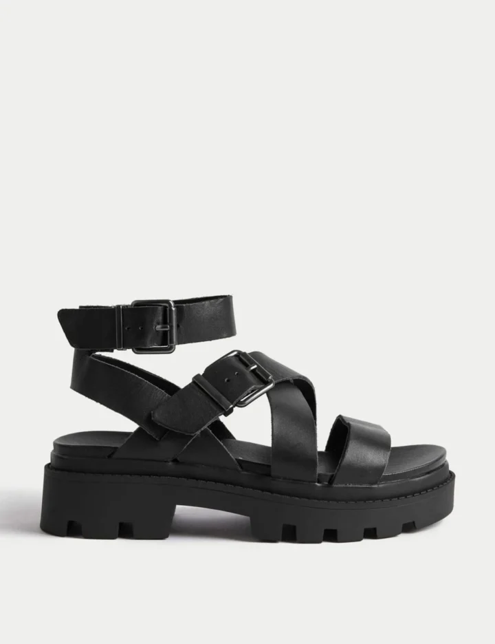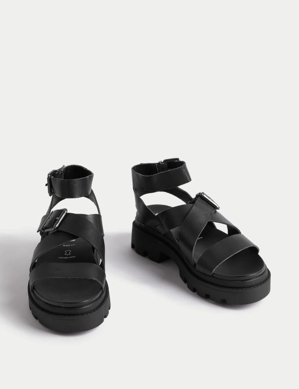 We’ve designed these sandals with supple leather criss-cross straps for a striking finish. They have a wide fit and a chunky mid heel with a cleated sole for added grip. A buckled ankle strap keeps them secure.