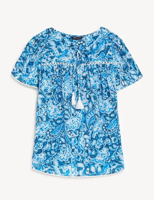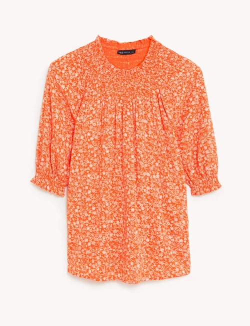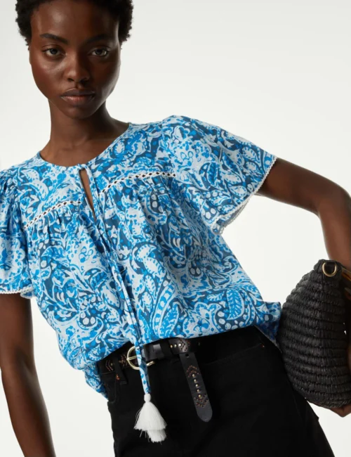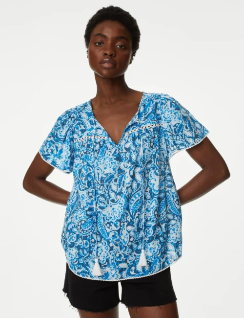 Cotton Blend Printed Shirred Blouse