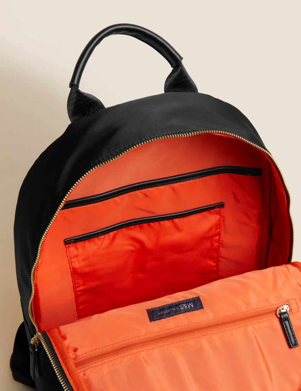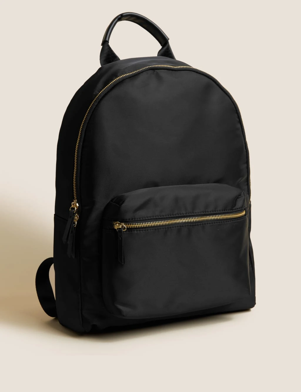 Keep essentials close at hand with this backpack. It can fit over a suitcase trolley for simple transportation. Zip fastening at the top and on the front pocket for security. Padded straps can be adjusted for comfort. Fully lined and features an interior zipped pocket, slip pocket and laptop compartment to keep your belongings organised. Wipe-clean finish for easy care.